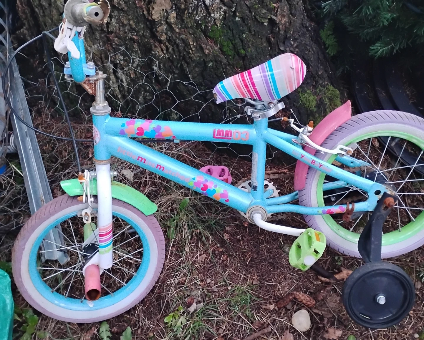 This is a light blue kids' BMX bike. It has colourful heart decals and a striped seat. The bike comes with training wheels attached. It's suitable for young riders learning to cycle.
