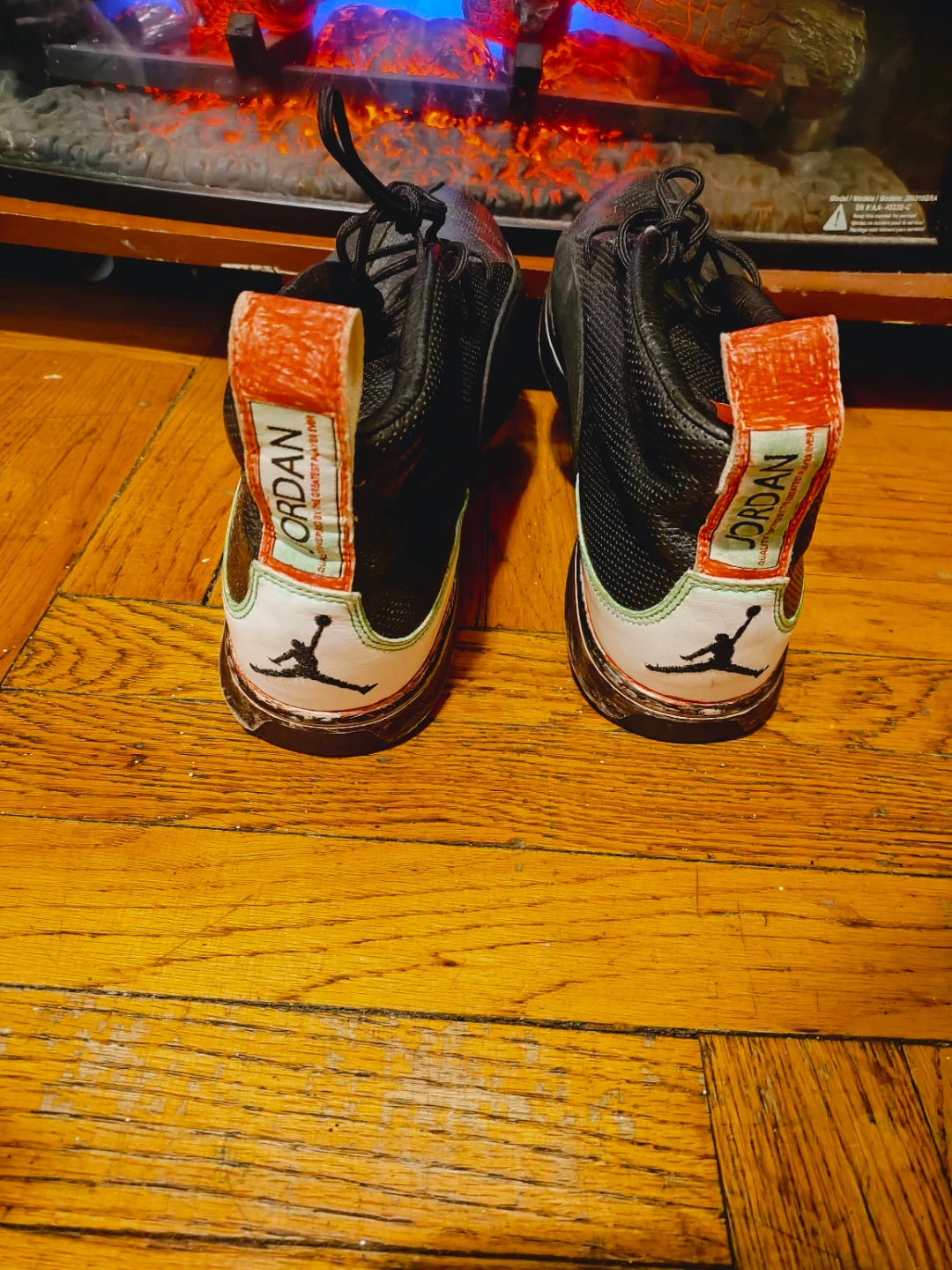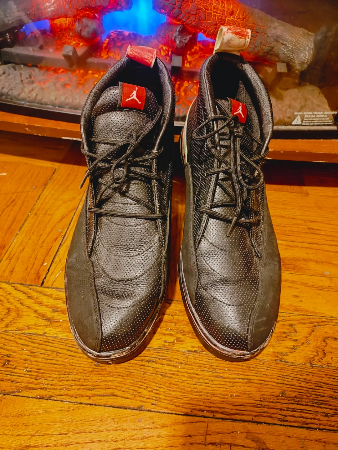 These Jordan shoes are primarily black with white and red accents. They feature a leather and mesh construction.