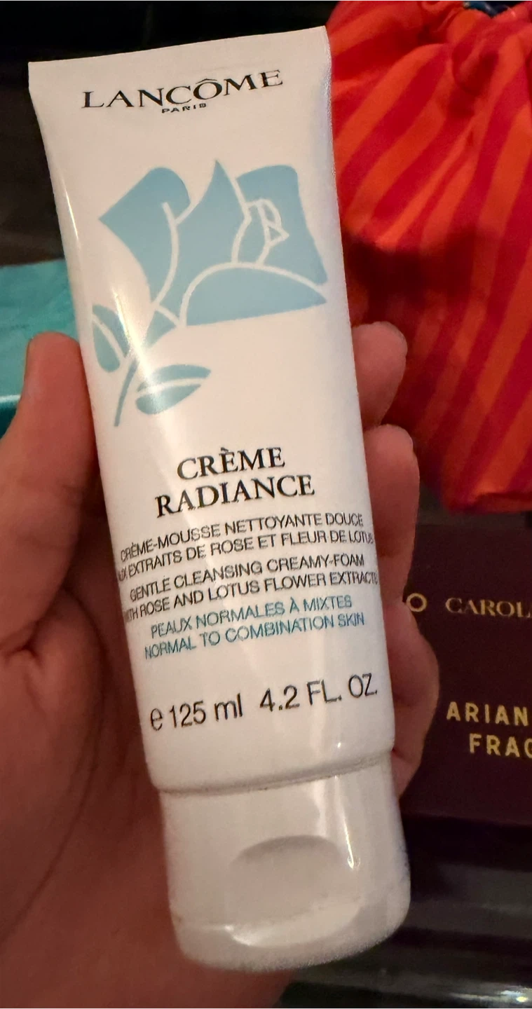 Lancôme Crème Radiance gentle cleansing creamy-foam. Contains rose and lotus flower extracts. Suitable for normal to combination skin. 125 ml (4.2 fl. oz.) bottle.