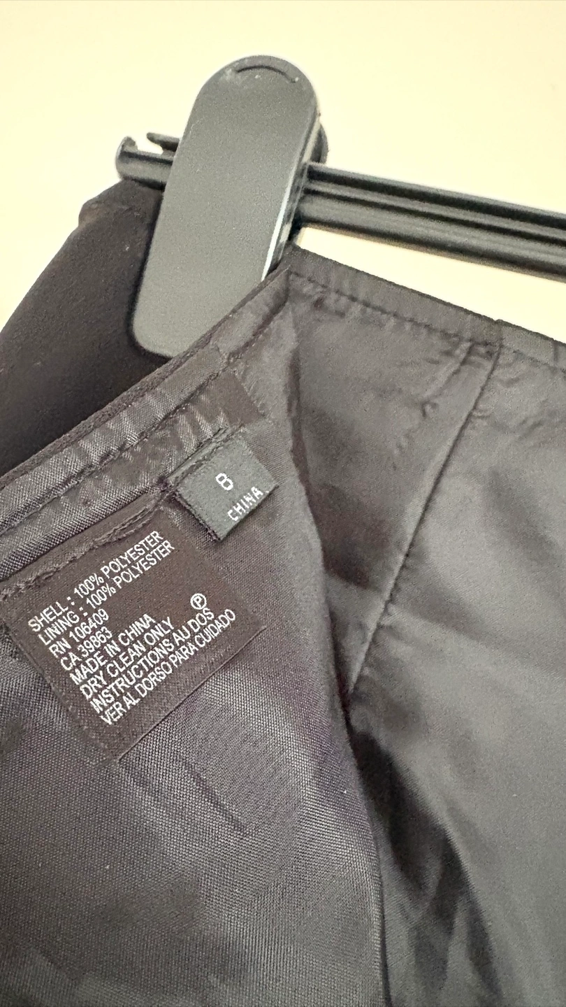 This is a black ruffle skirt. Shell is 100% polyester and lining is 100% polyester. Size 8.