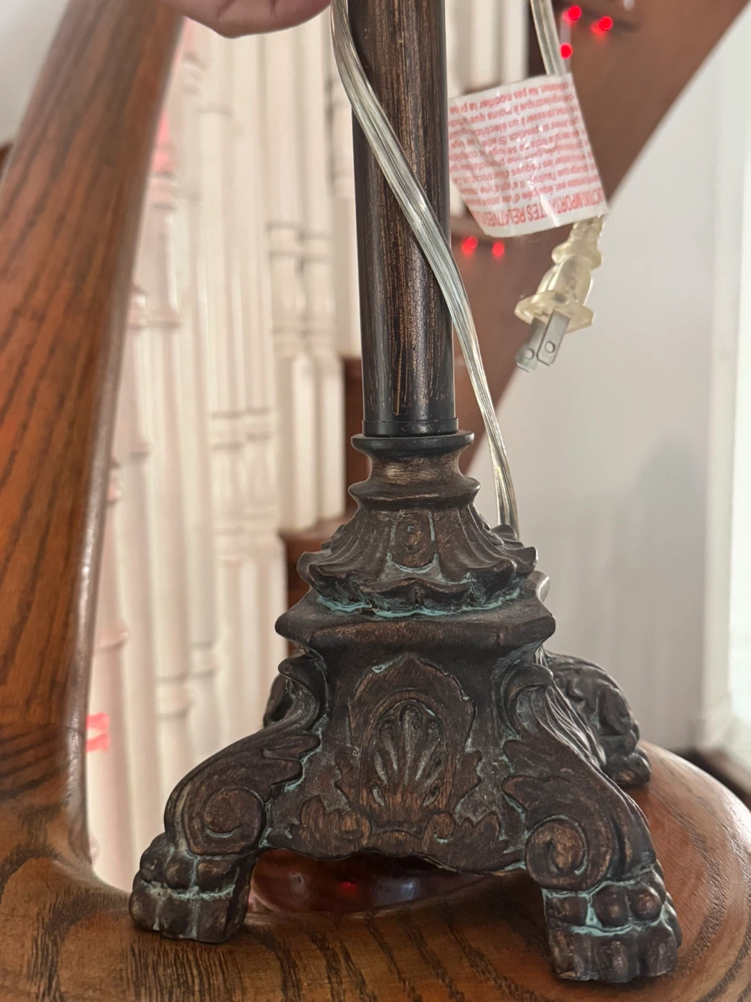 This table lamp features a classic beige fabric shade with dark trim. It has an ornate, antique-style bronze base with intricate detailing. Perfect for adding a touch of vintage charm to any room!