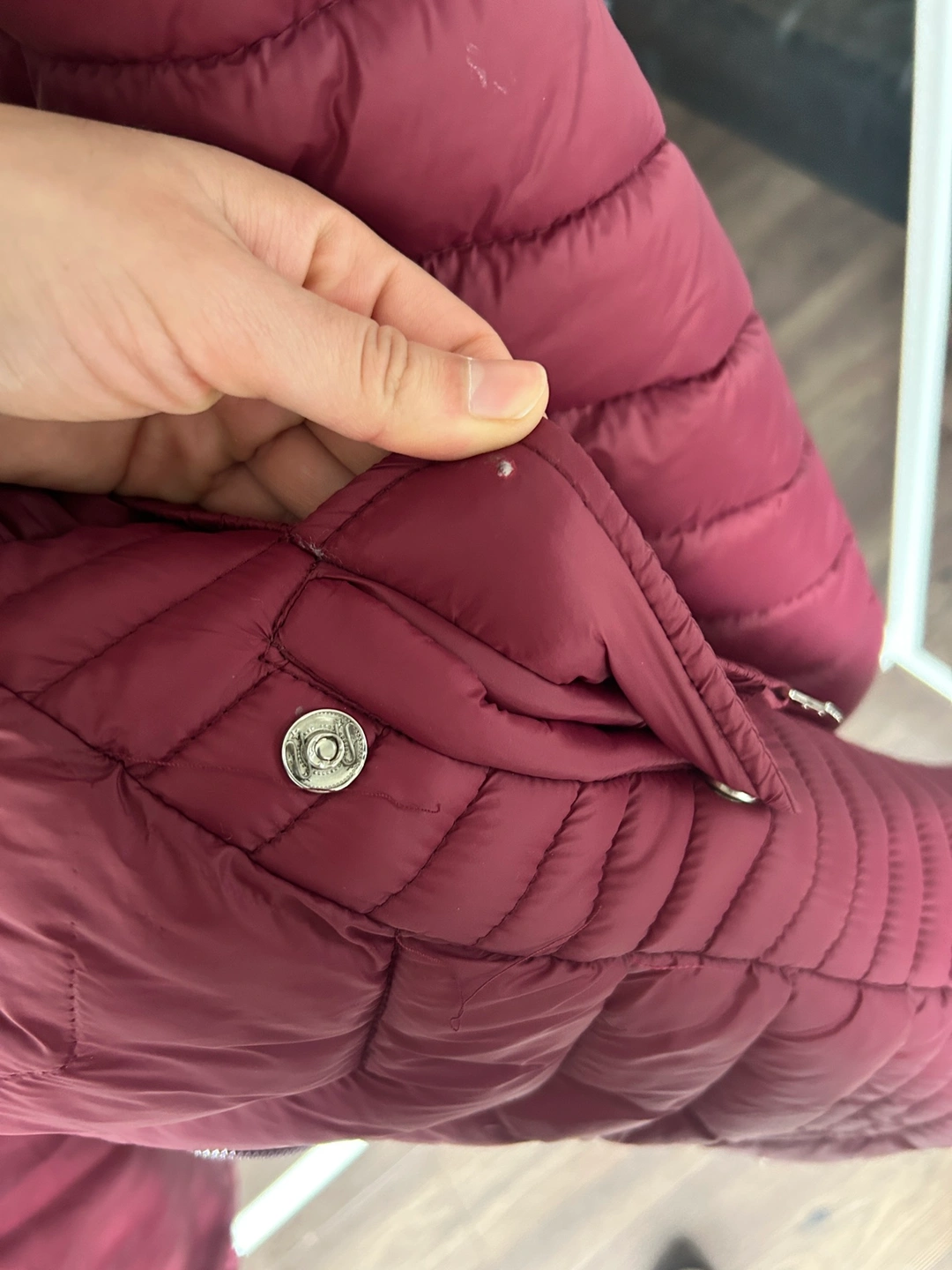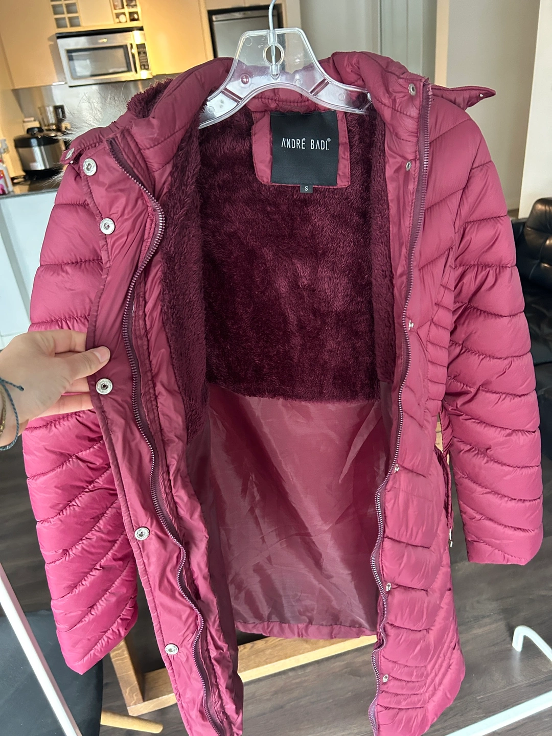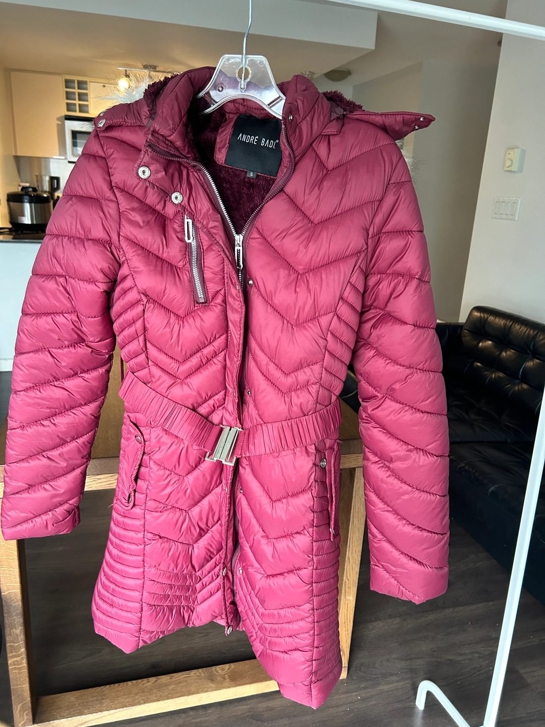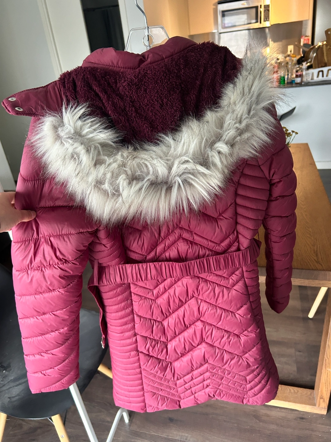 Red hooded winter coat with faux fur trim, a belt, and a fleece lining. Size small. It’s missing one button