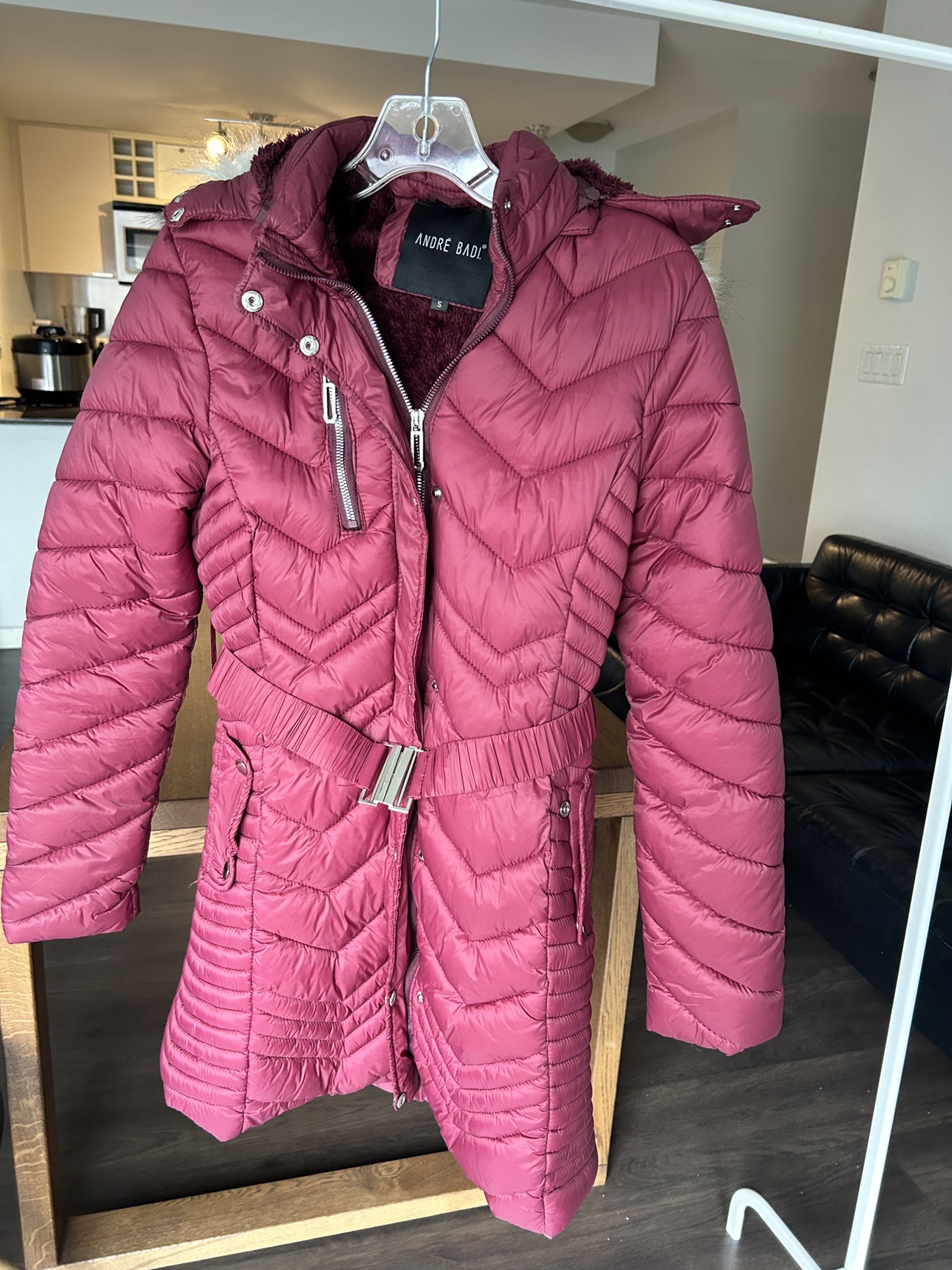 Red hooded winter coat with faux fur trim, a belt, and a fleece lining. Size small. It’s missing one button