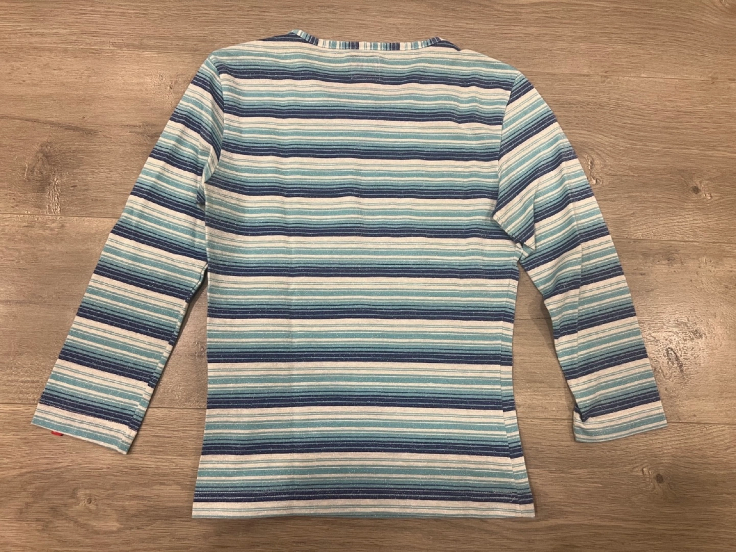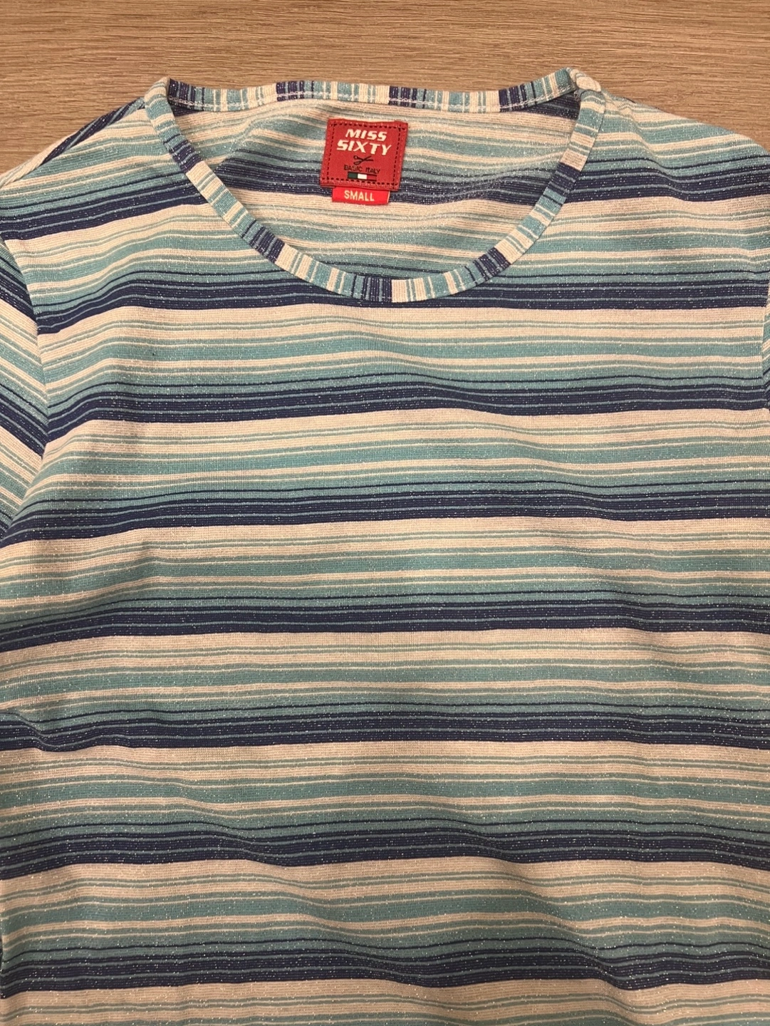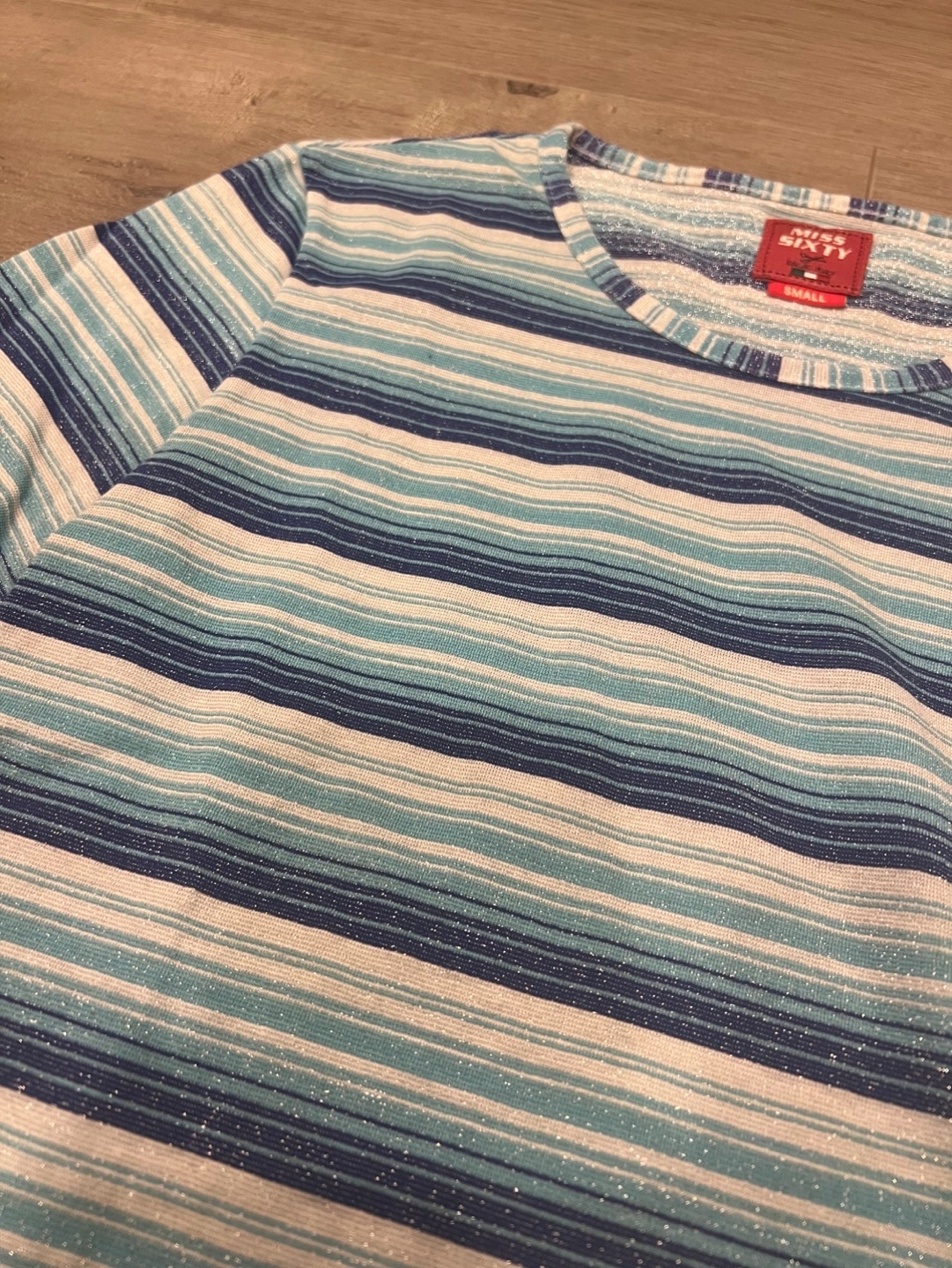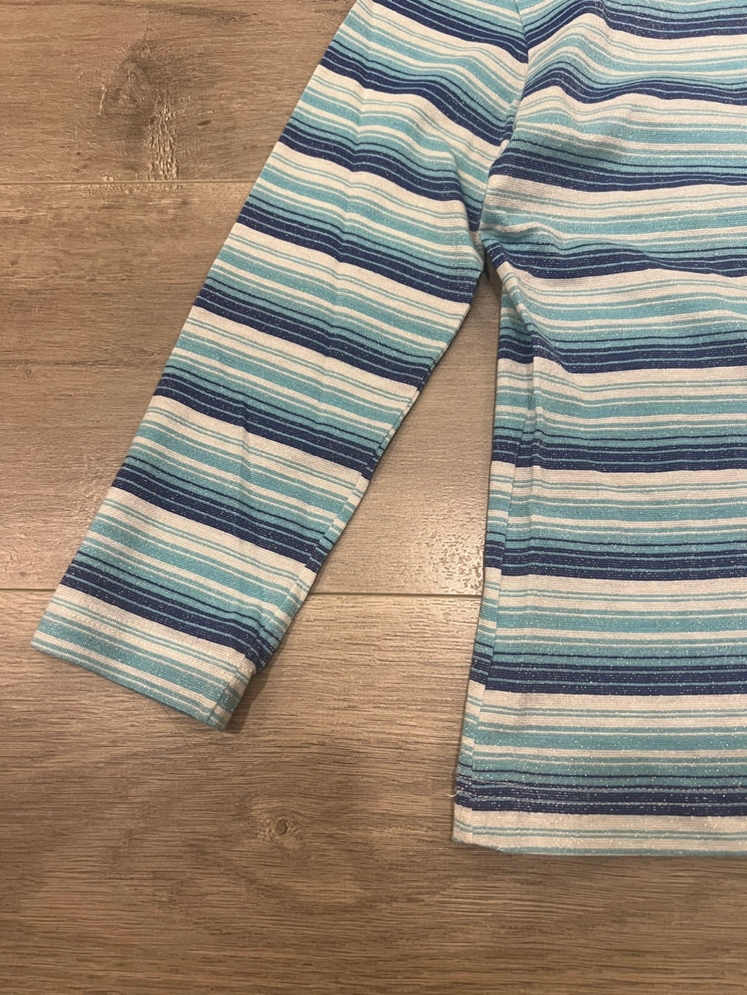 Women's medium sleeve shirt. Size small. Horizontal stripes in shades of blue, white, and silver. Slightly see through sparkly fabric. Good condition.