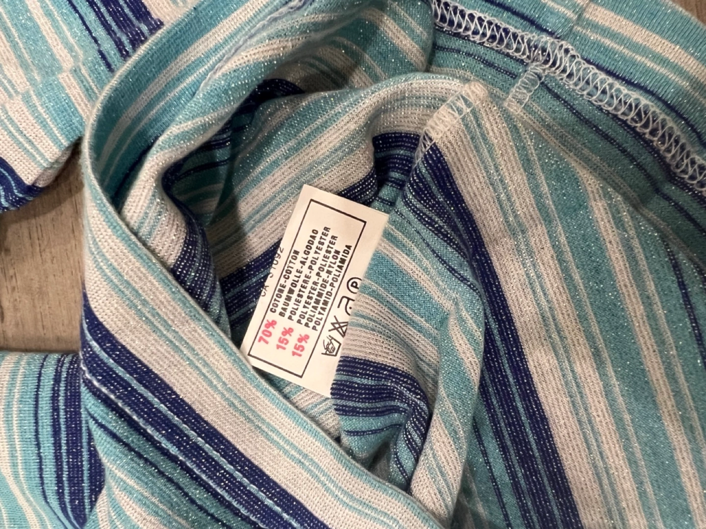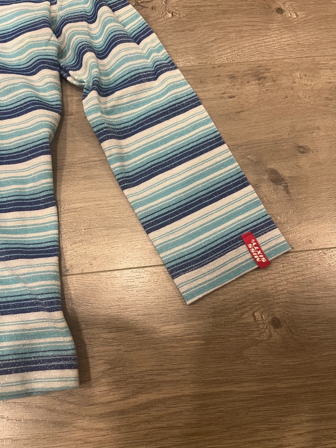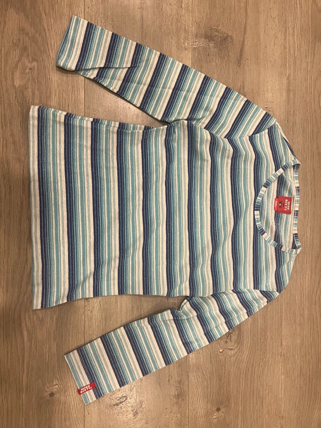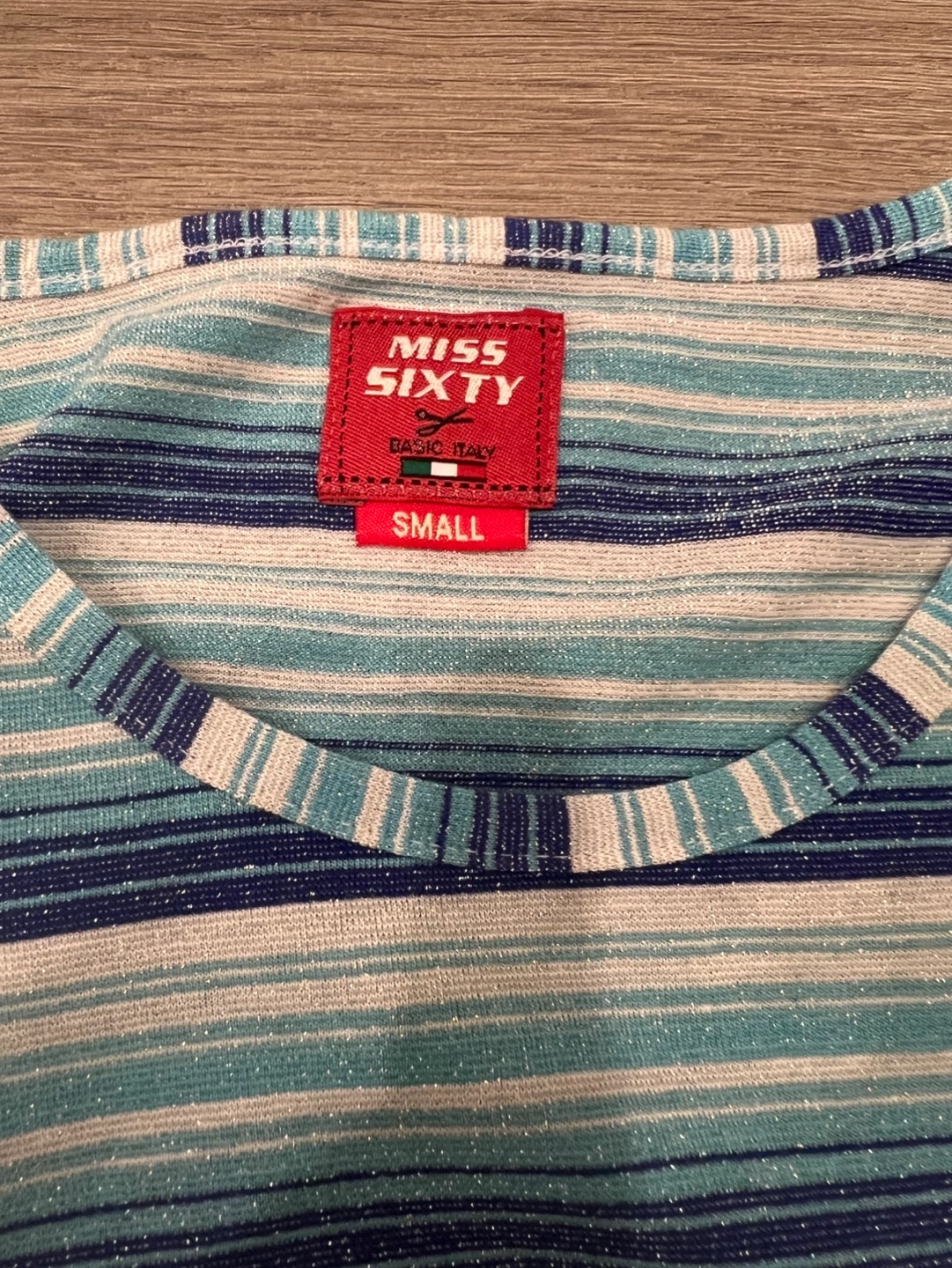 Women's medium sleeve shirt. Size small. Horizontal stripes in shades of blue, white, and silver. Slightly see through sparkly fabric. Good condition.