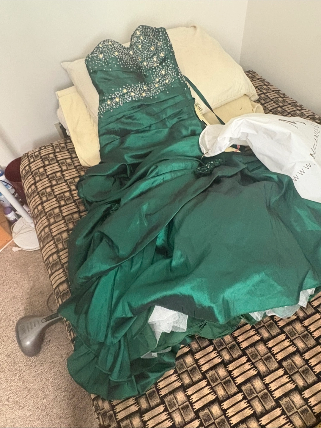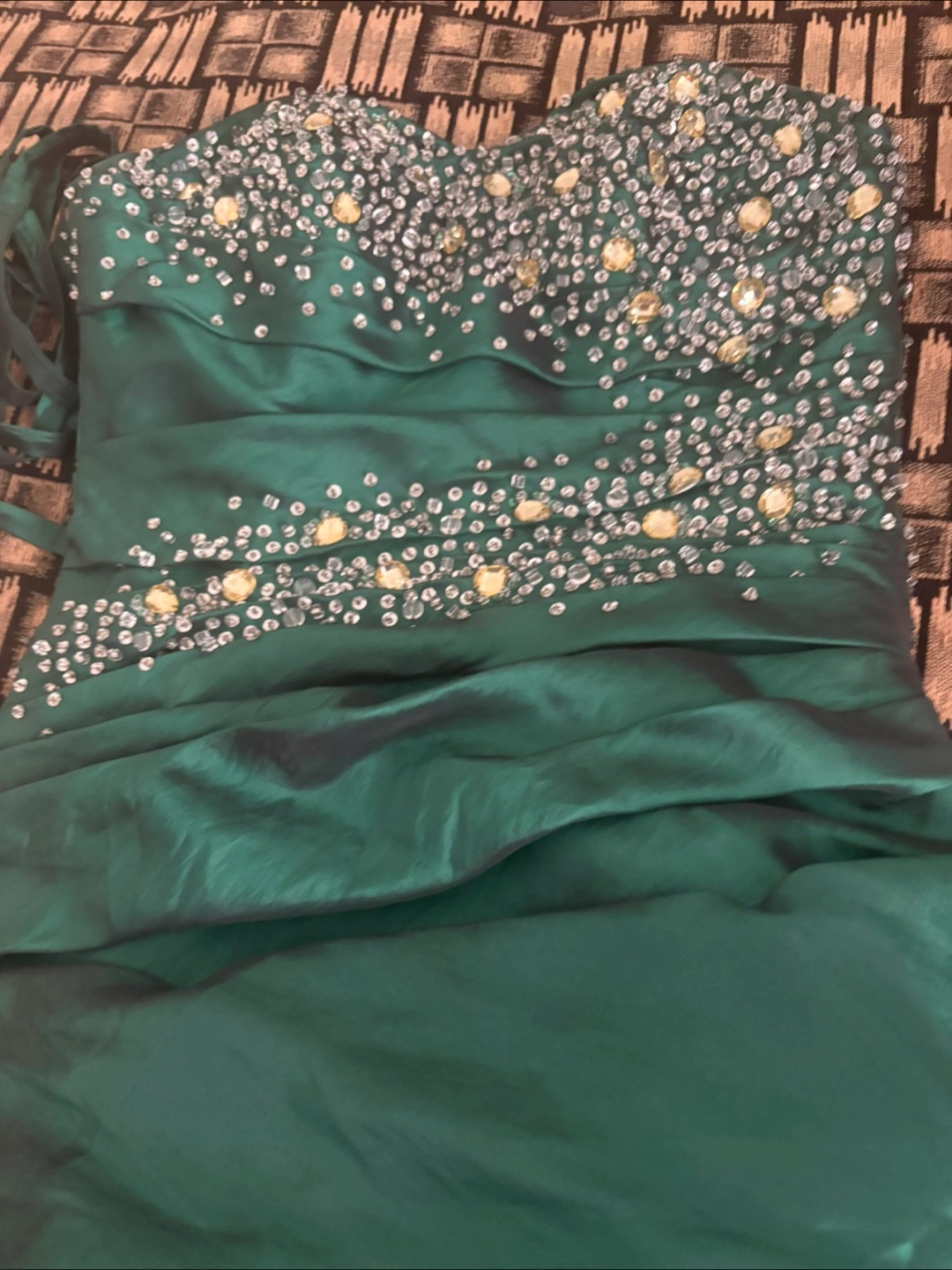 Beautiful emerald green dress, perfect for prom or a special evening! It's adorned with delicate embellishments and has a flattering silhouette. In great condition and ready to make someone feel amazing