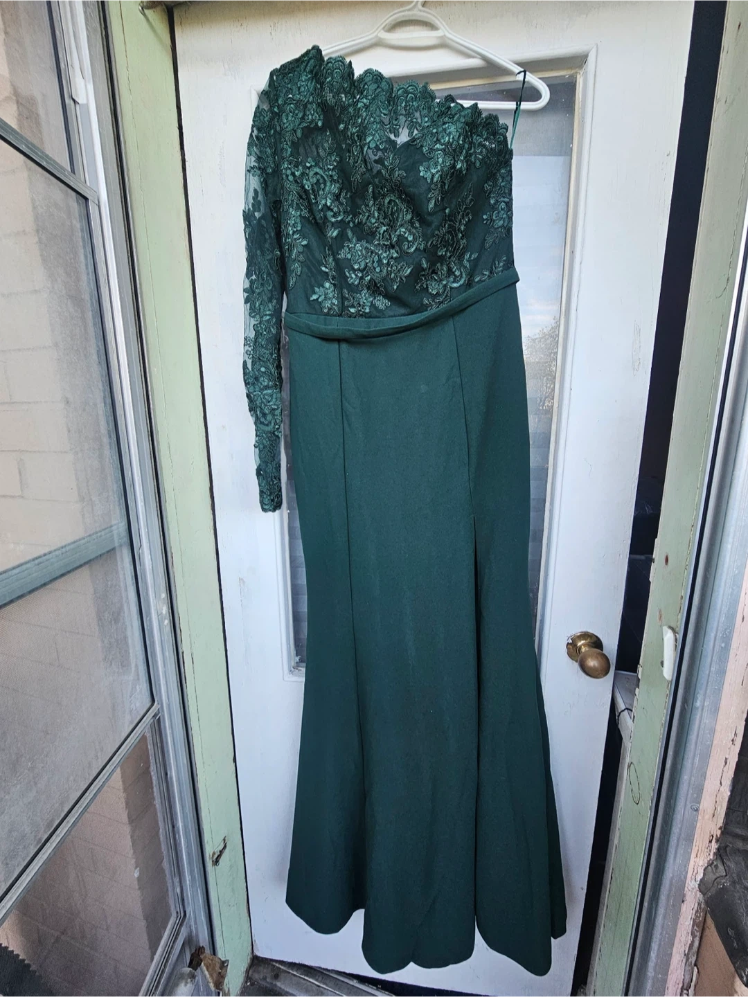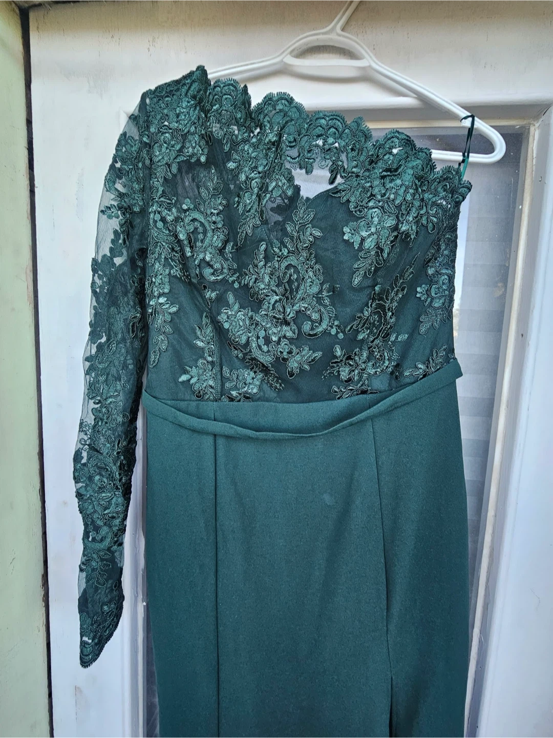 Selling a beautiful emerald green dress! It features a unique one-shoulder design with delicate lace detailing on the bodice and sleeve. Perfect for a special occasion or evening event. It's in great condition and ready for a new home