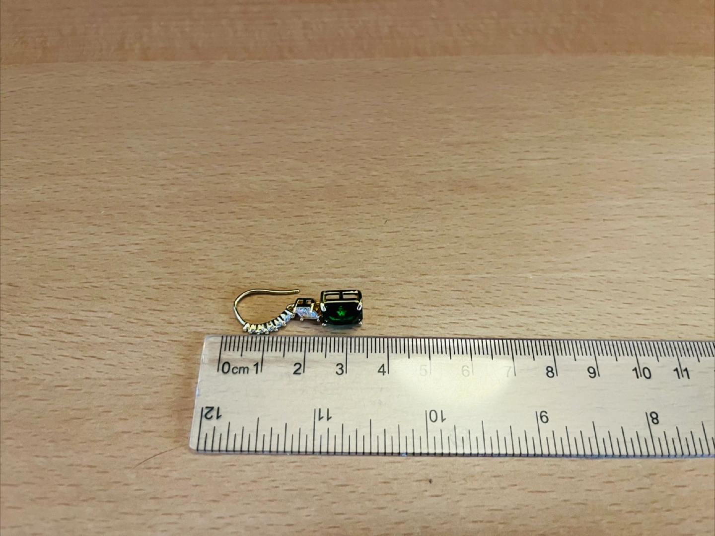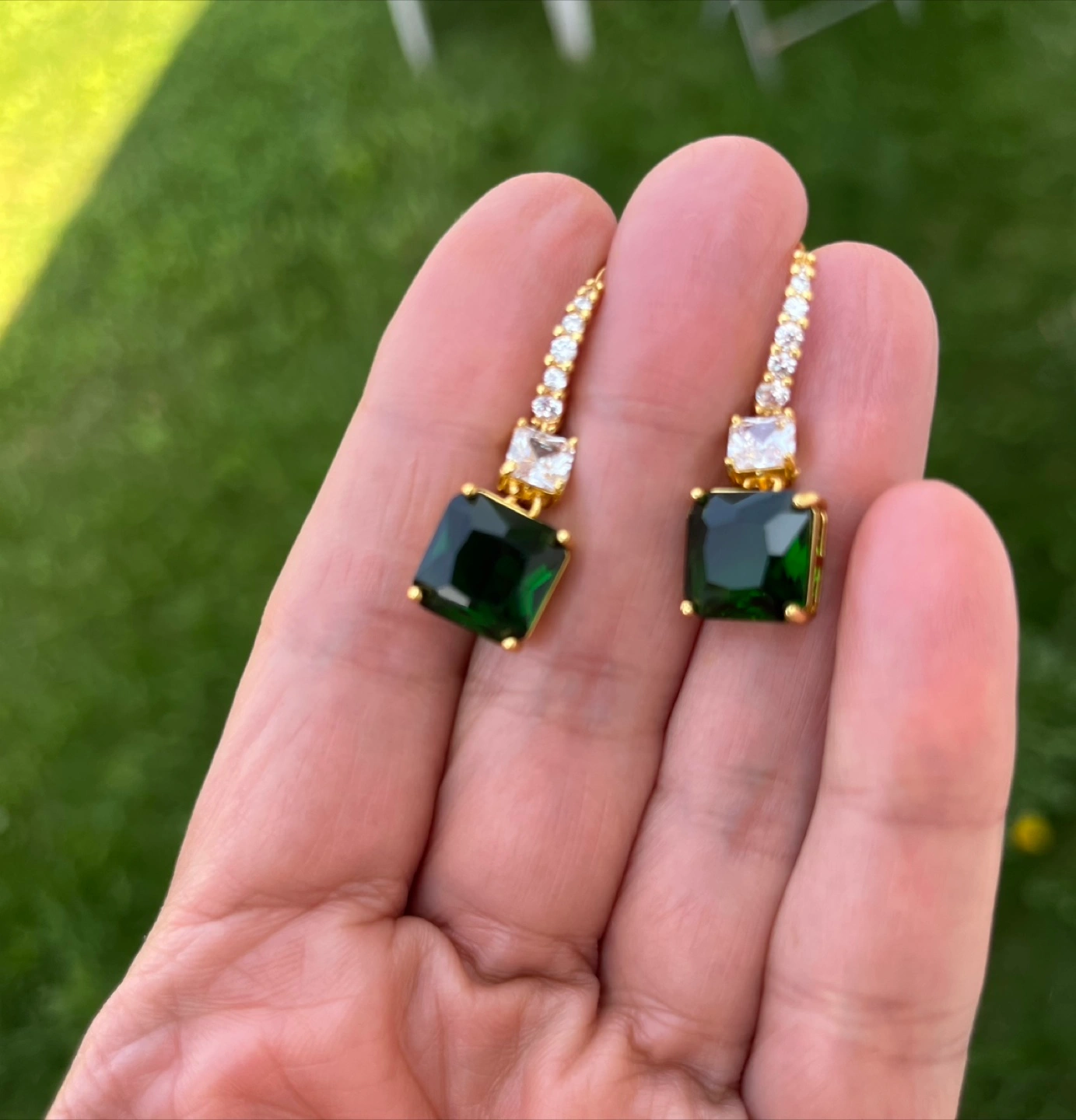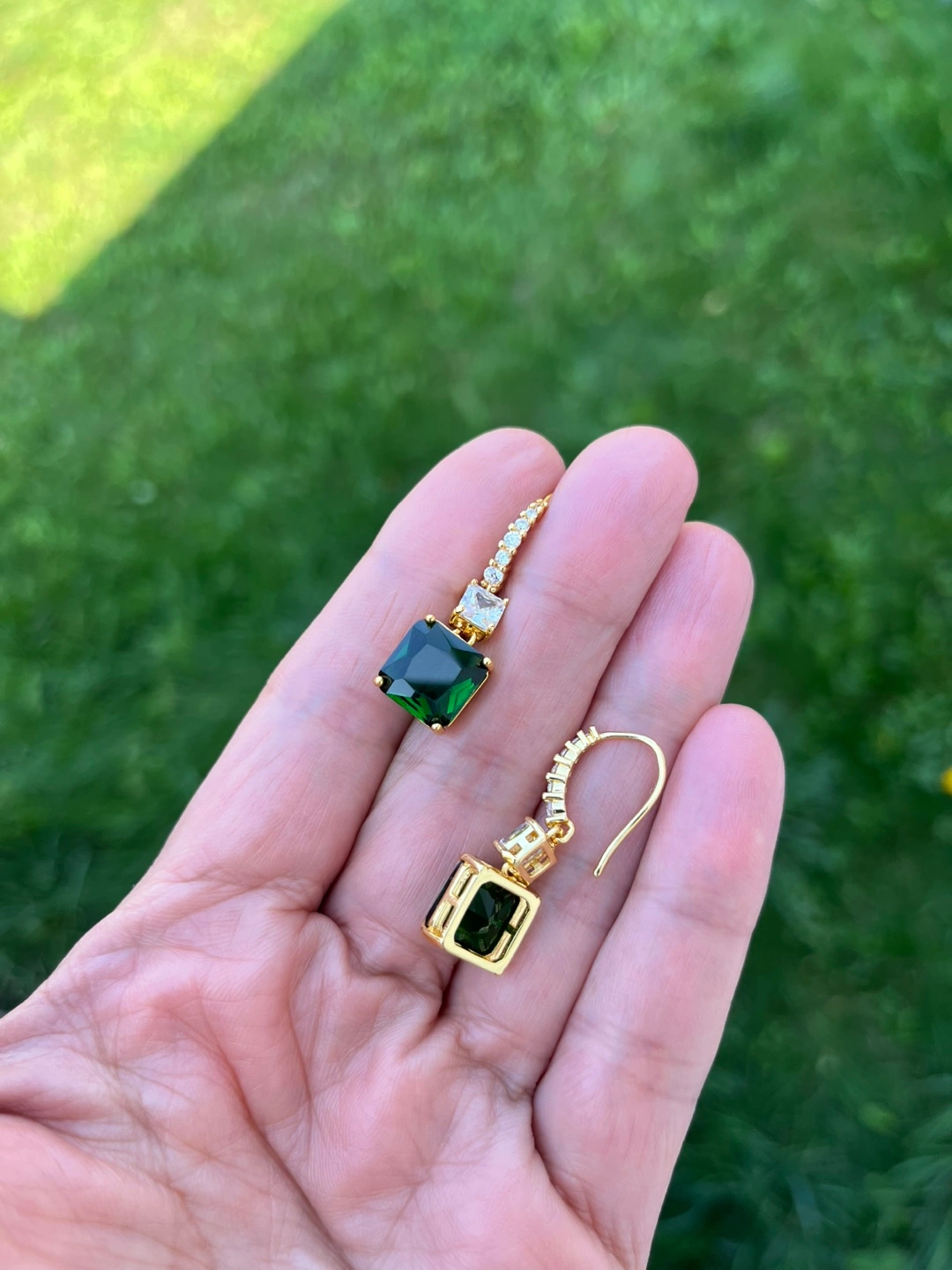 These are a pair of lovely dangle earrings featuring emerald green square stones and gold accents