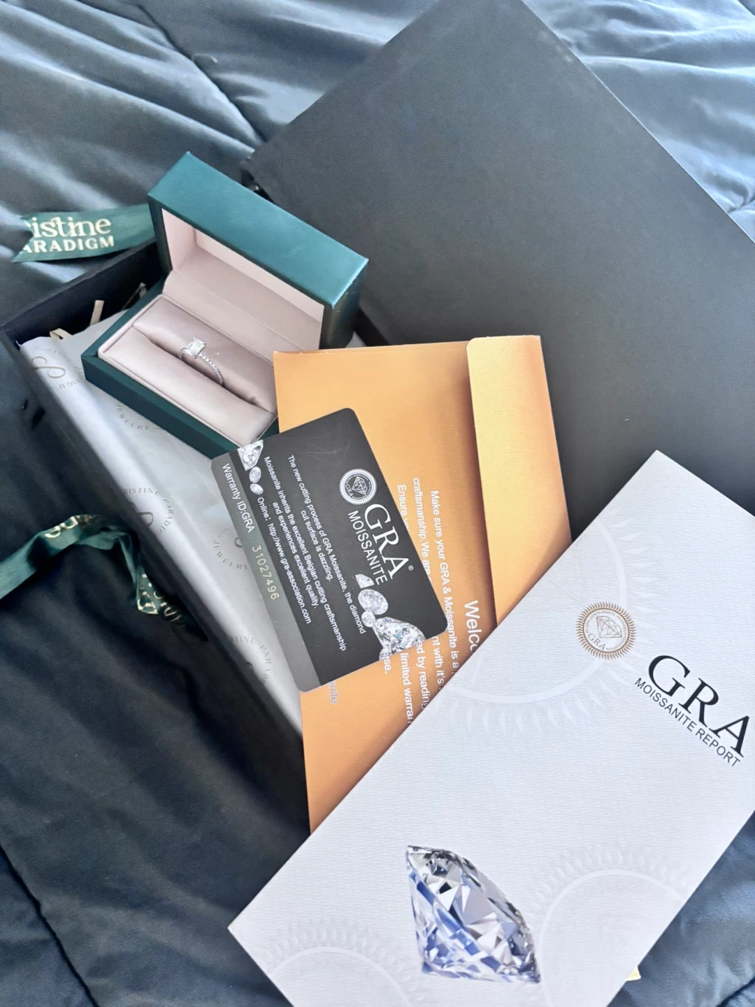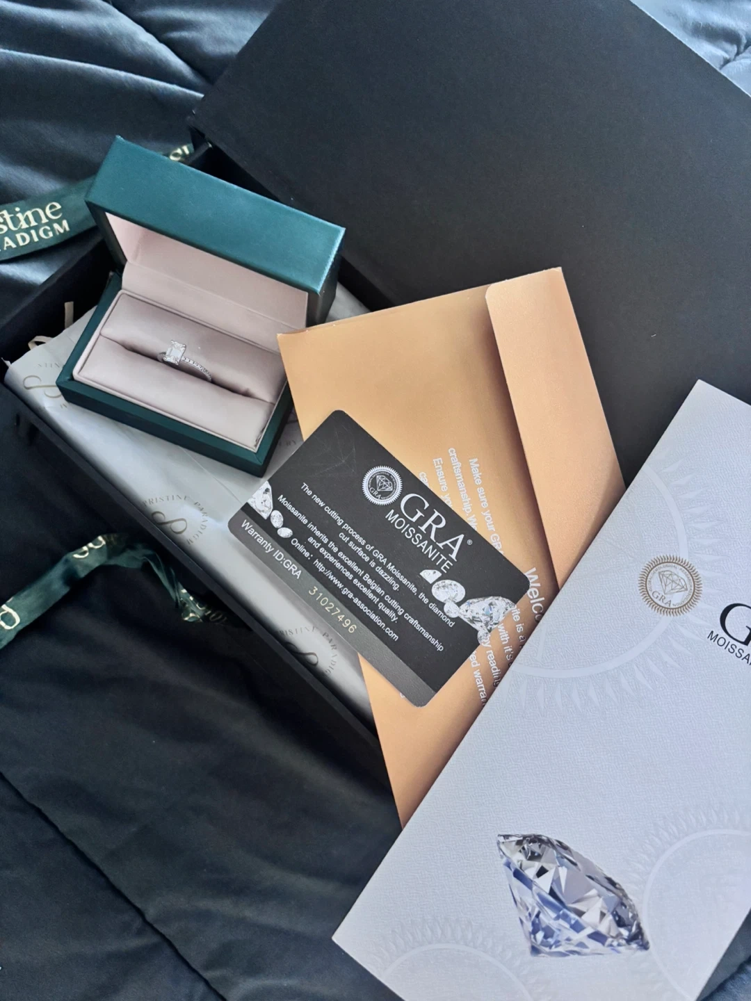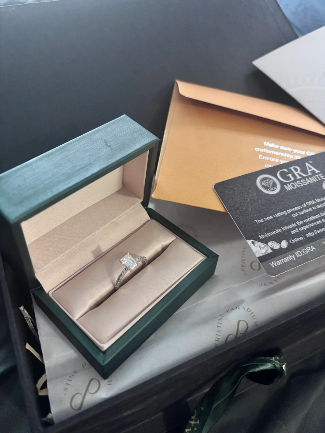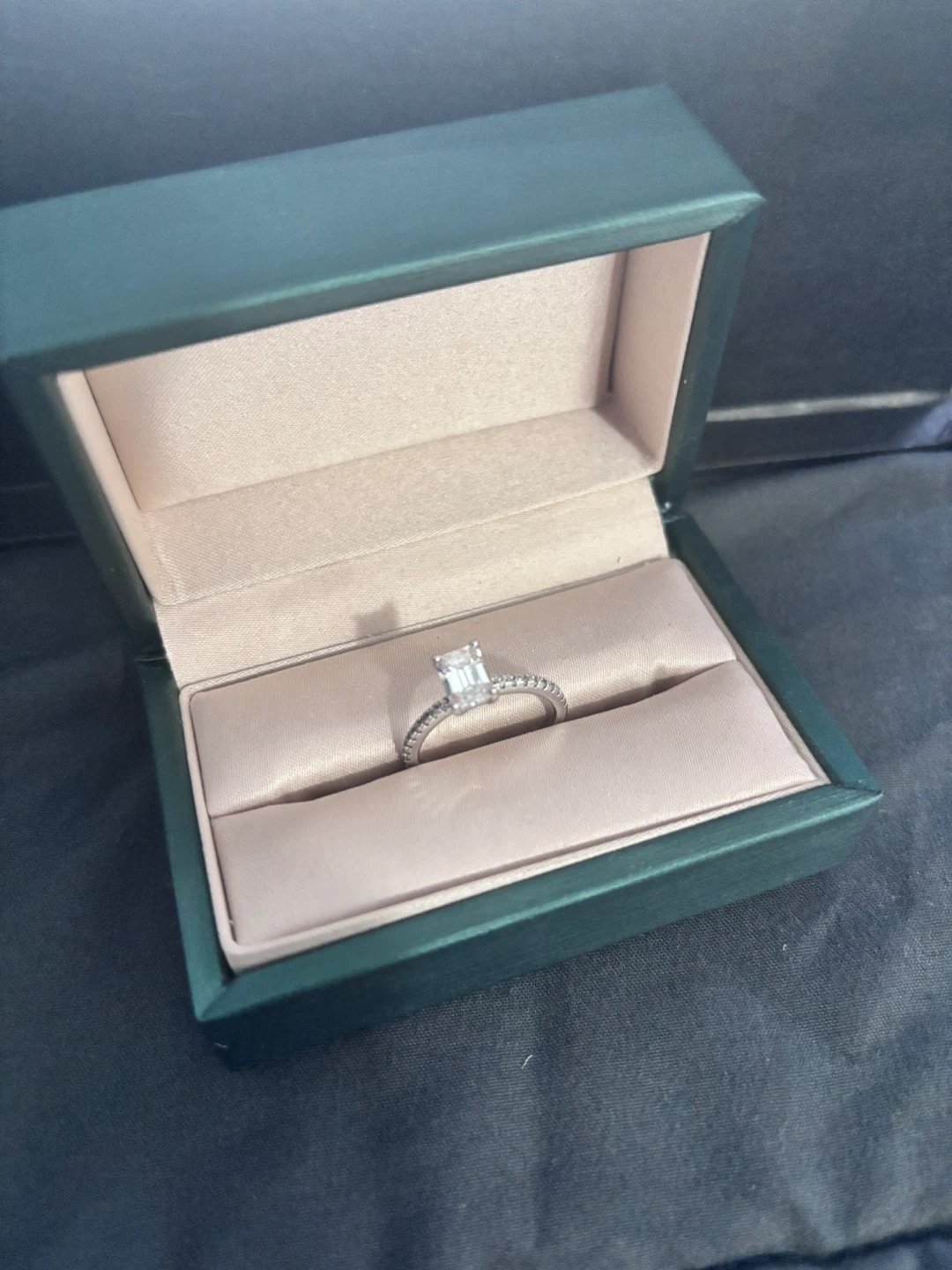 266Selling customized and never used Emerald Pavé Ring, 1 CT & Real Moissanite Labgrown (passed diamond tester). Stone Color is White Clarity: VVS1 Size: US 6 Platinum Vermeil (100% S925 Sterling Silver Base metal electroplated with 18k platinum) It all comes with the box, cleaning cloth and GRA Moissanite Authentication Certificate. Just need to get rid of this asap, as I’m moving
