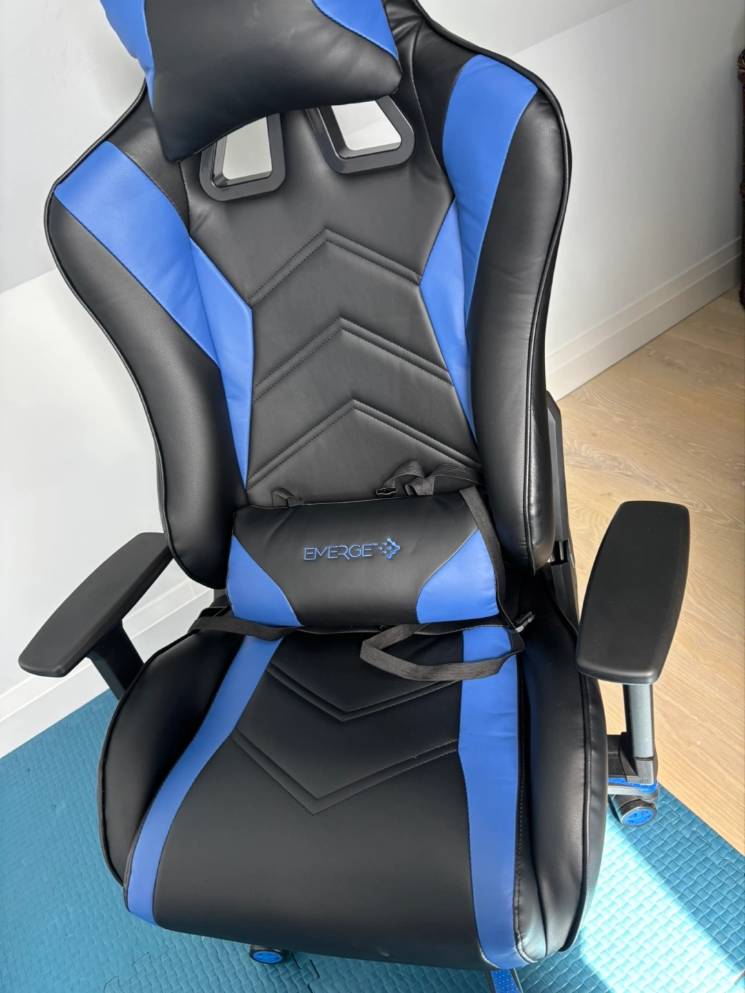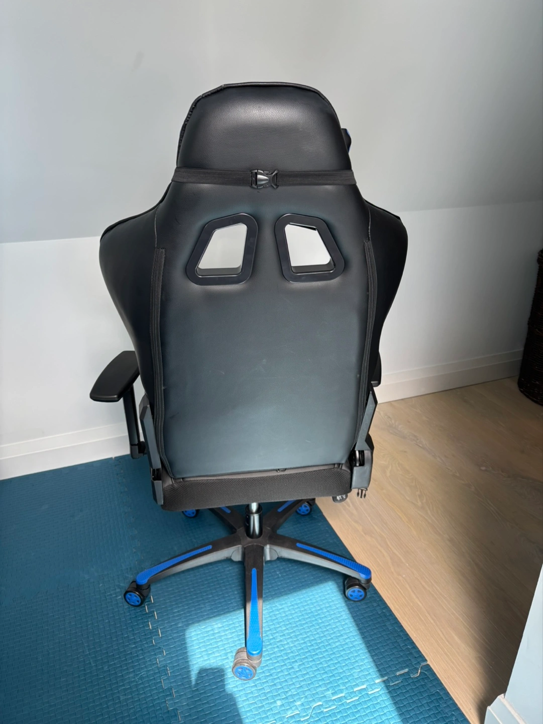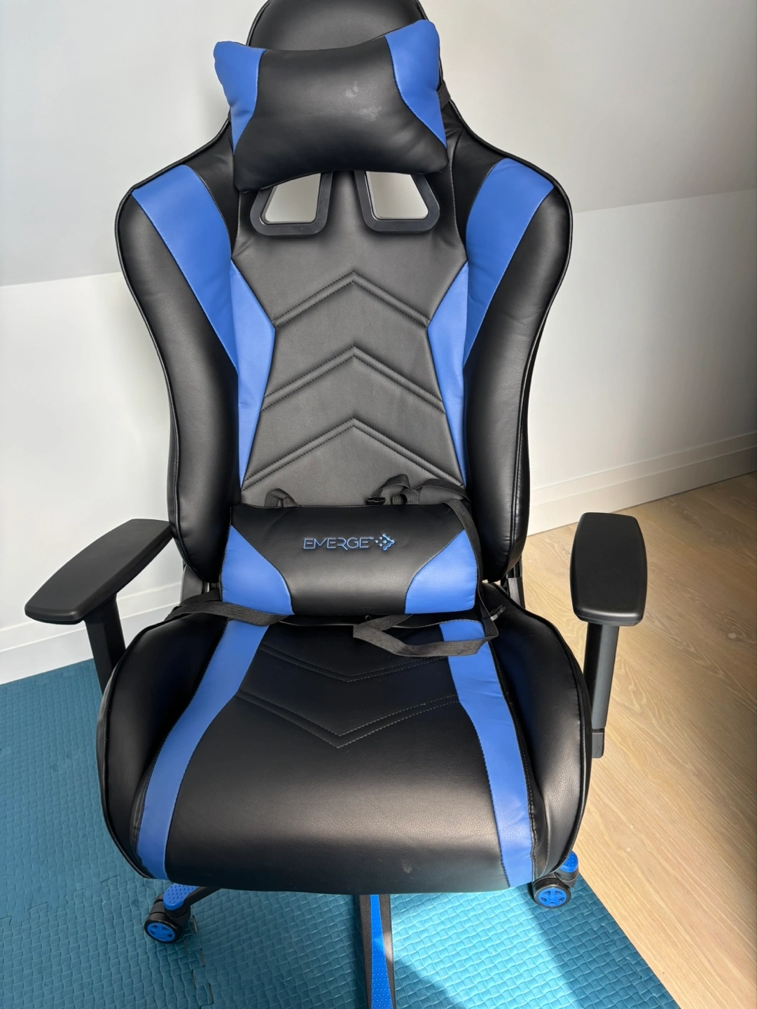 Comfortable gaming chair. Black and blue colour scheme. Includes lumbar and headrest pillows. Adjustable armrests. Excellent condition.