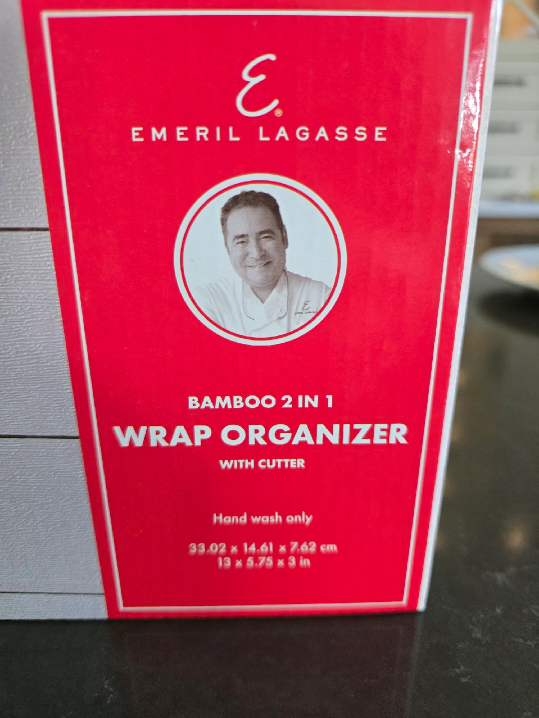 65Selling a brand new Emeril Lagasse Bamboo 2 in 1 Wrap Organizer! It's crafted from durable bamboo with a sealed and hand-polished finish. It also features a rust-resistant sliding hidden cutter for safe and precise cuts. This organizer fits up to 12 inches long and includes hardware for wall mounting. Dimensions are 33.02 x 14.61 x 7.62 cm (13 x 5.75 x 3 in)