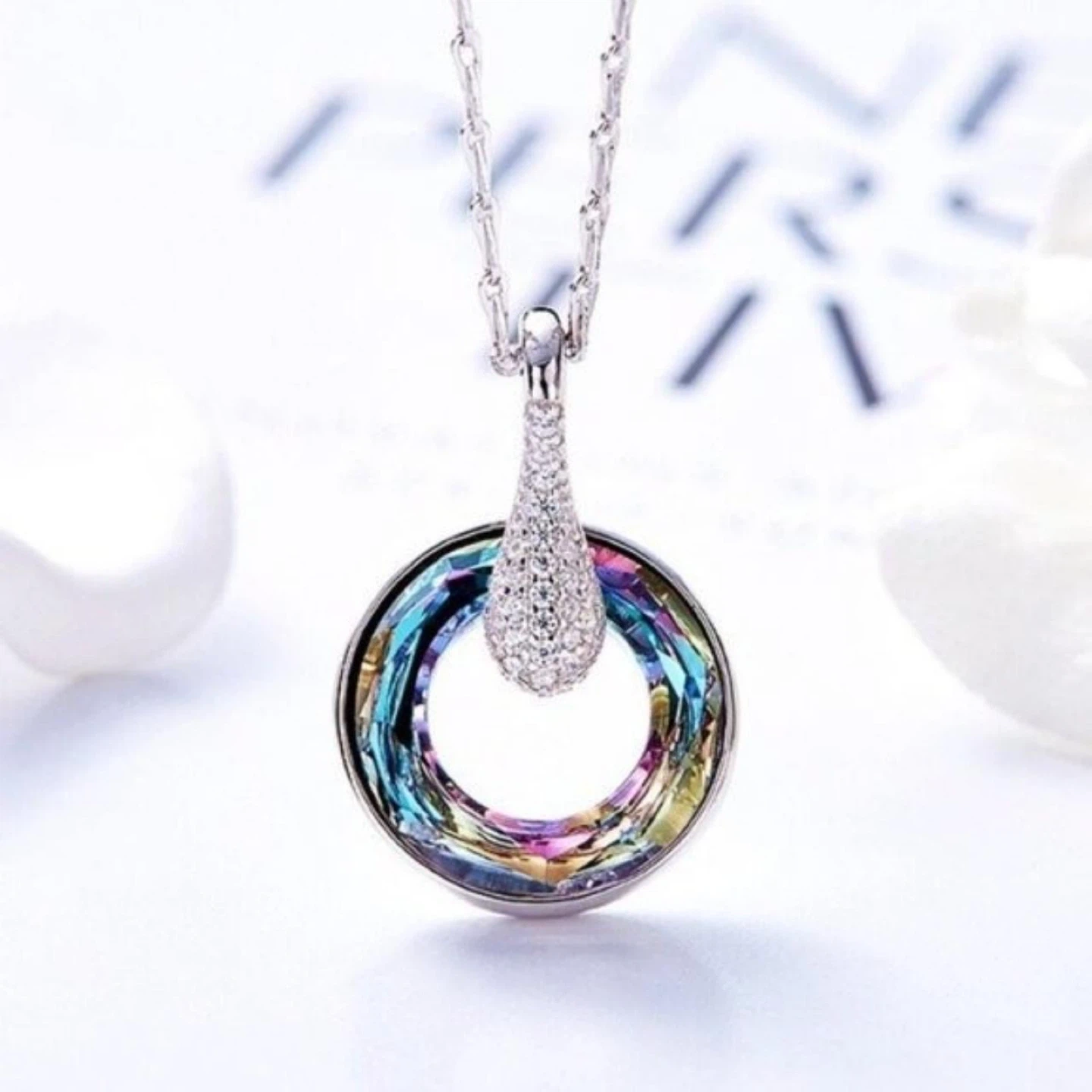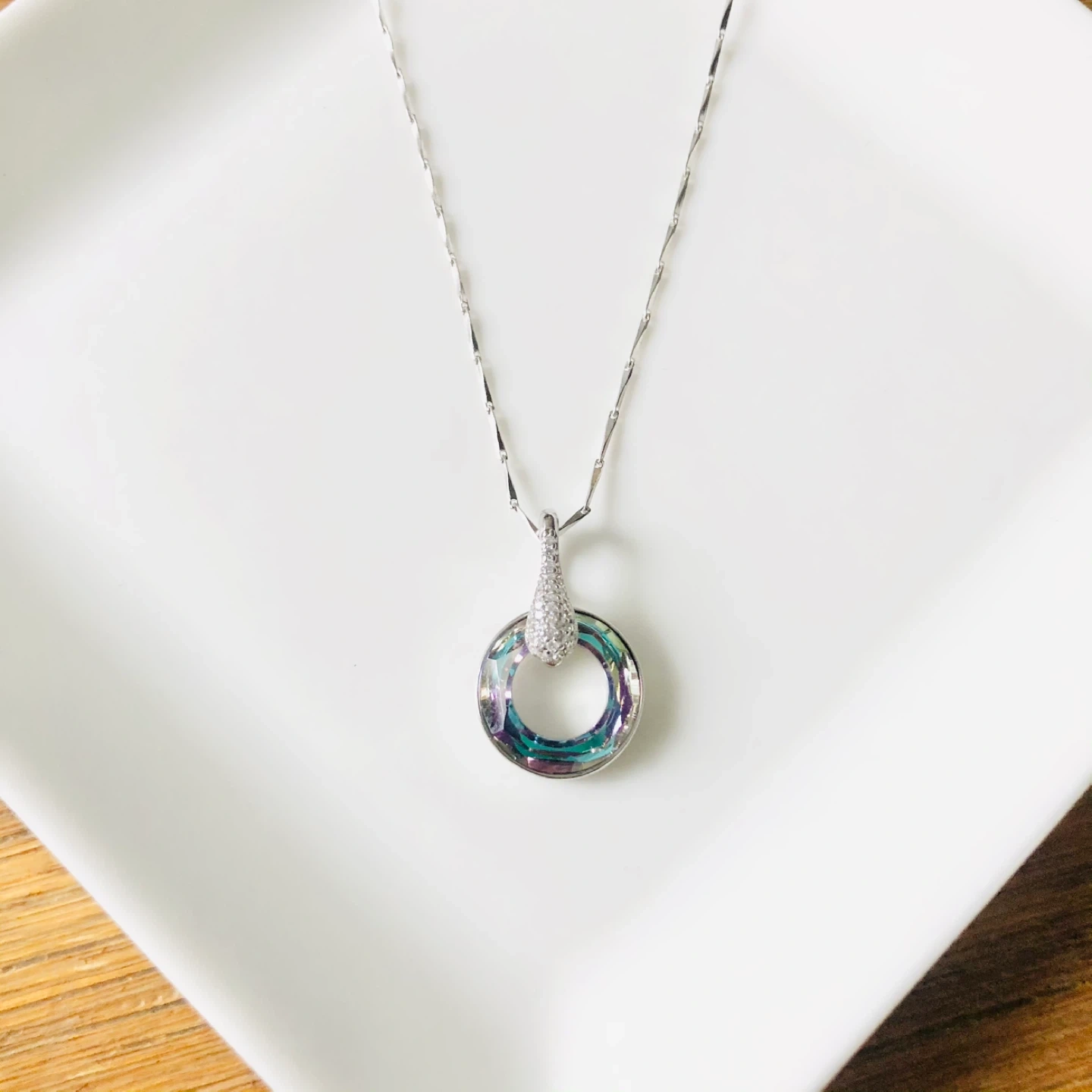 S925 Sterling Silver Iridescent Crystal Round Pendant Necklace