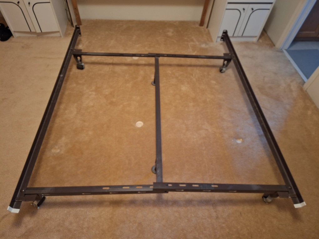 Heavy duty durable steel frame, easily switch sizes from twin/full/queen to fit your space. Wheels are convenient to move the bed as needed, great condition!