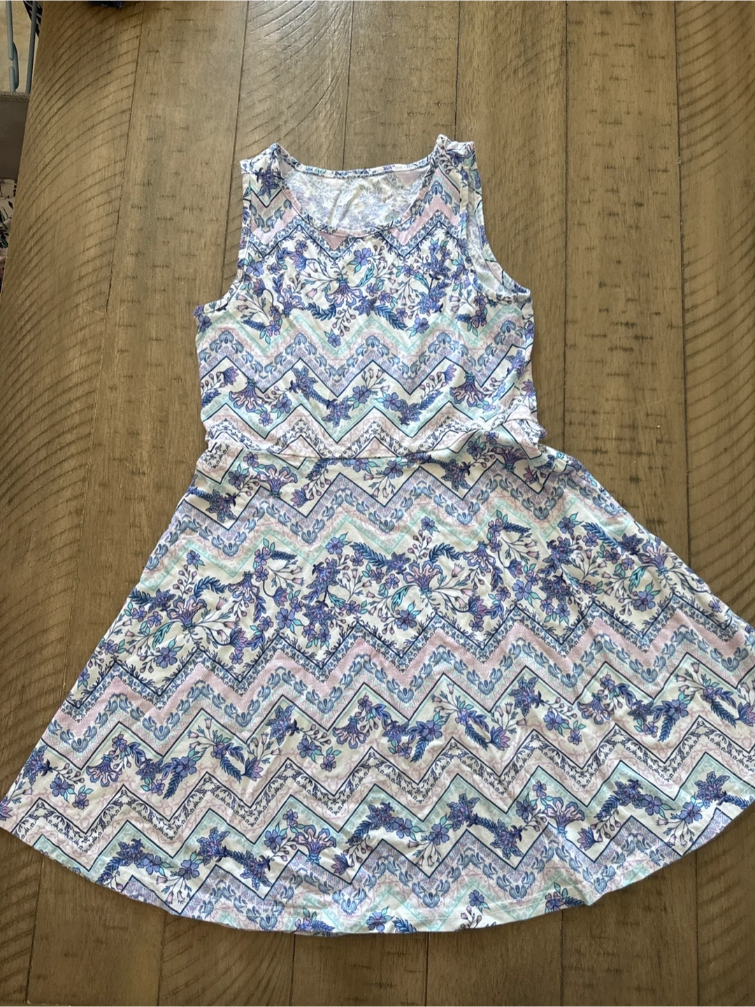 This girls' sleeveless dress features a fun floral and chevron print. It's made from a soft, stretchy material for comfortable wear. The empire waist and flared skirt give it a playful silhouette. Perfect for warm weather! Machine washable.