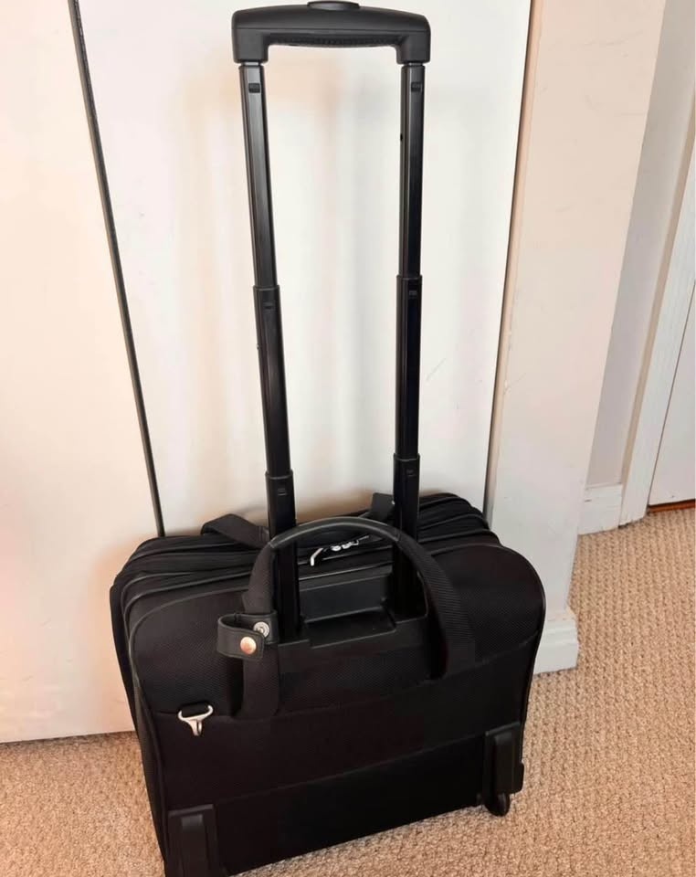 Clean rolling laptop carry-on bag in great condition. Wheels roll smoothly and handle extends properly. Perfect for short trips or business use. Smoke-free home.