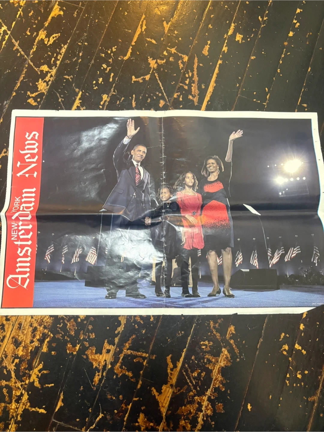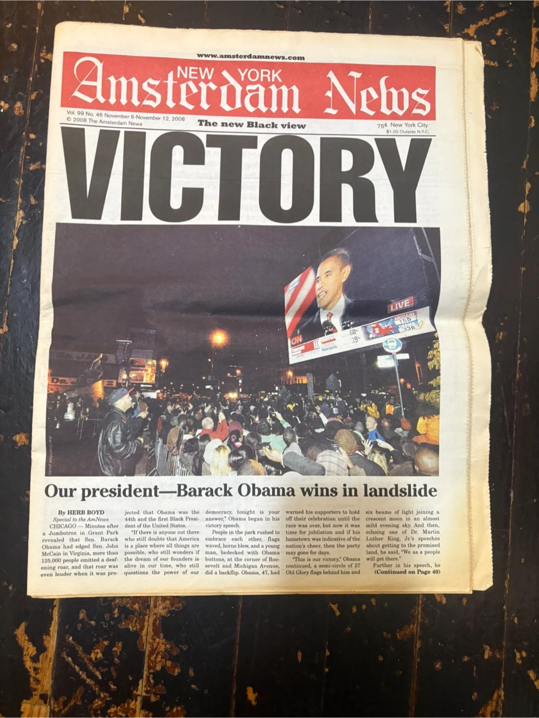 This is a special edition of the New York Amsterdam News from November 6, 2008. It features coverage of Barack Obama's election as President. The newspaper includes photos and articles about the historic event. It's a collector's item for those interested in political history.