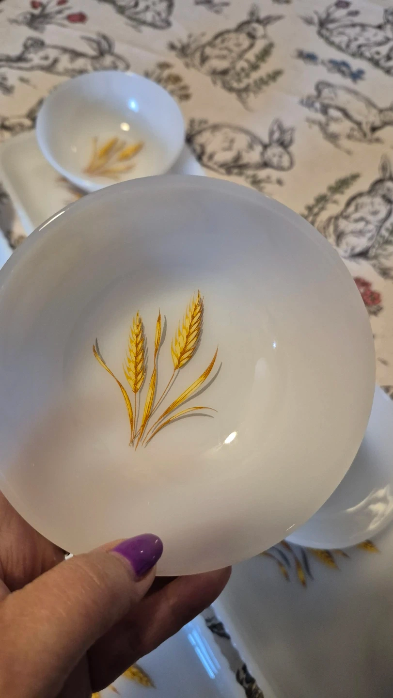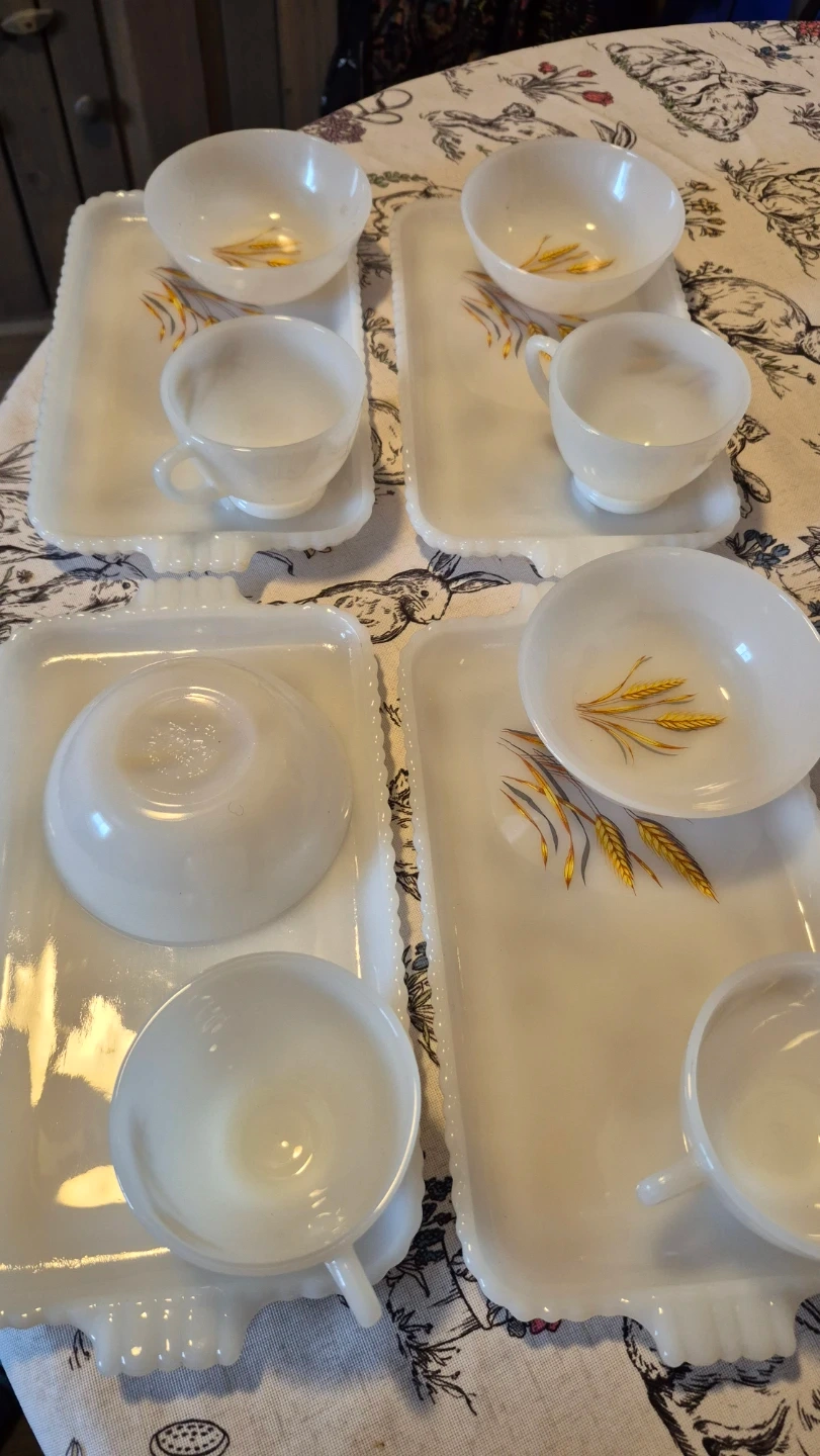 This is a set of milk glass serving pieces featuring a delicate wheat stalk design. It includes several bowls and rectangular trays. Milk glass material.