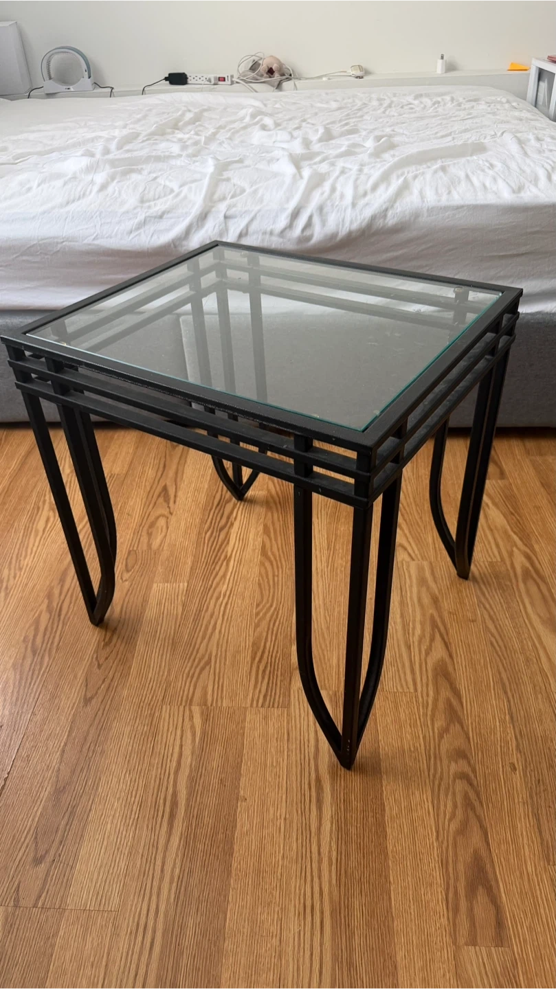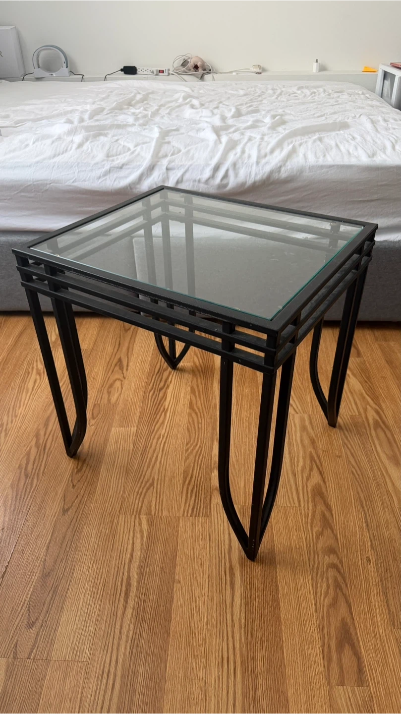 A square end table with a black metal frame and a glass top. It's got a modern design with curved legs. This table's compact size makes it handy for placing next to a couch or chair.