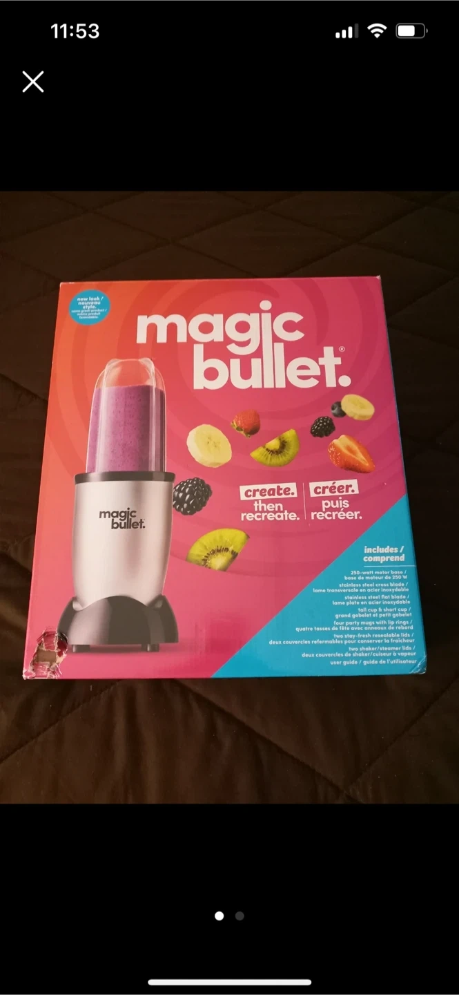 Selling a Magic Bullet blender! It comes with a 250-watt motor base, stainless steel cross blade, stainless steel flat blade, tall cup & short cup, four party mugs with lip rings, two stay-fresh resealable lids, two shaker/steamer lids, and a user guide. Brand new unwanted Christmas gift.