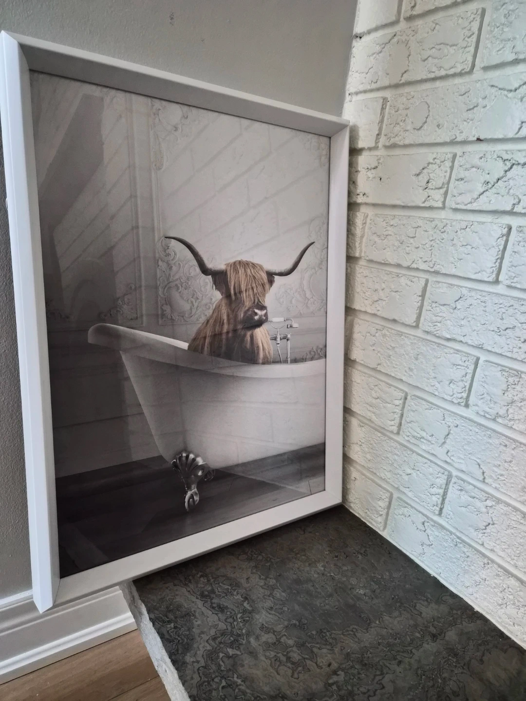 A charming framed print featuring a Highland cow enjoying a relaxing bath. It's a unique piece that would add a touch of whimsy to any room