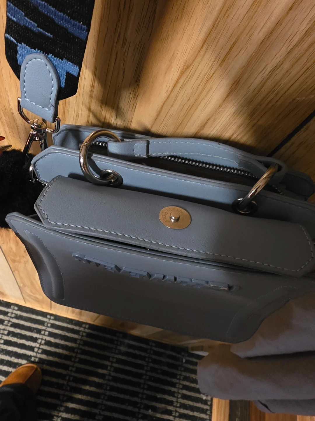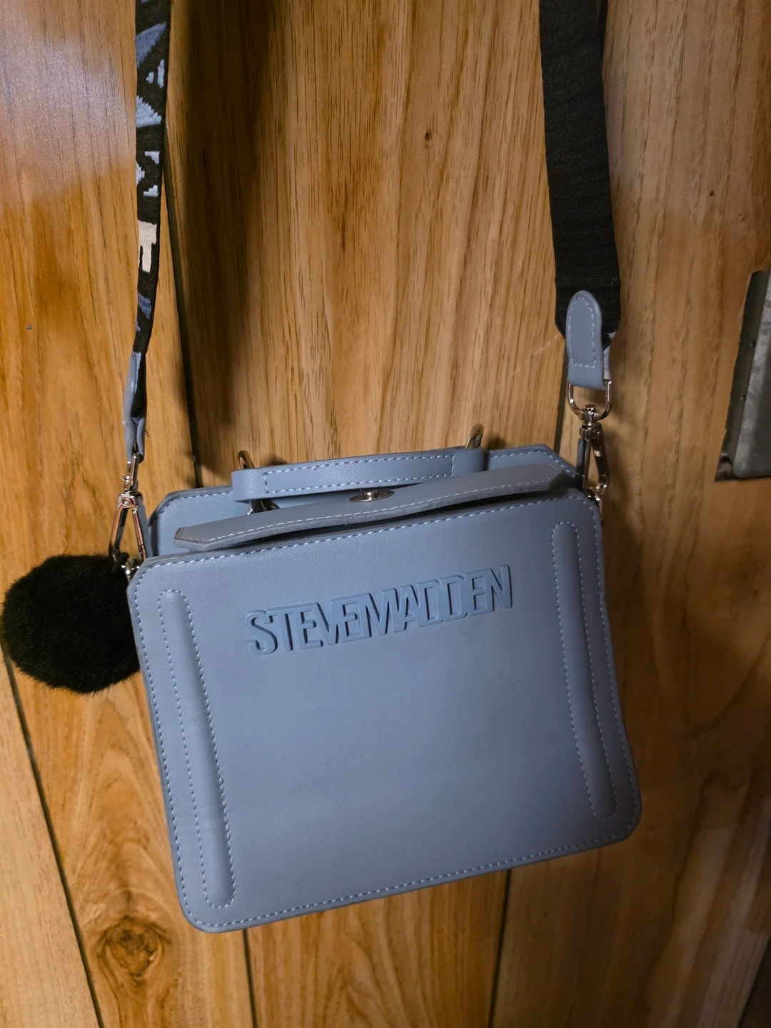 Selling a cute Steve Madden crossbody bag in a lovely blue colour! It's in great condition and has a stylish strap with the brand name on it. Perfect for carrying your essentials!