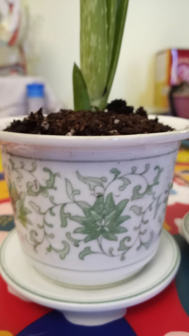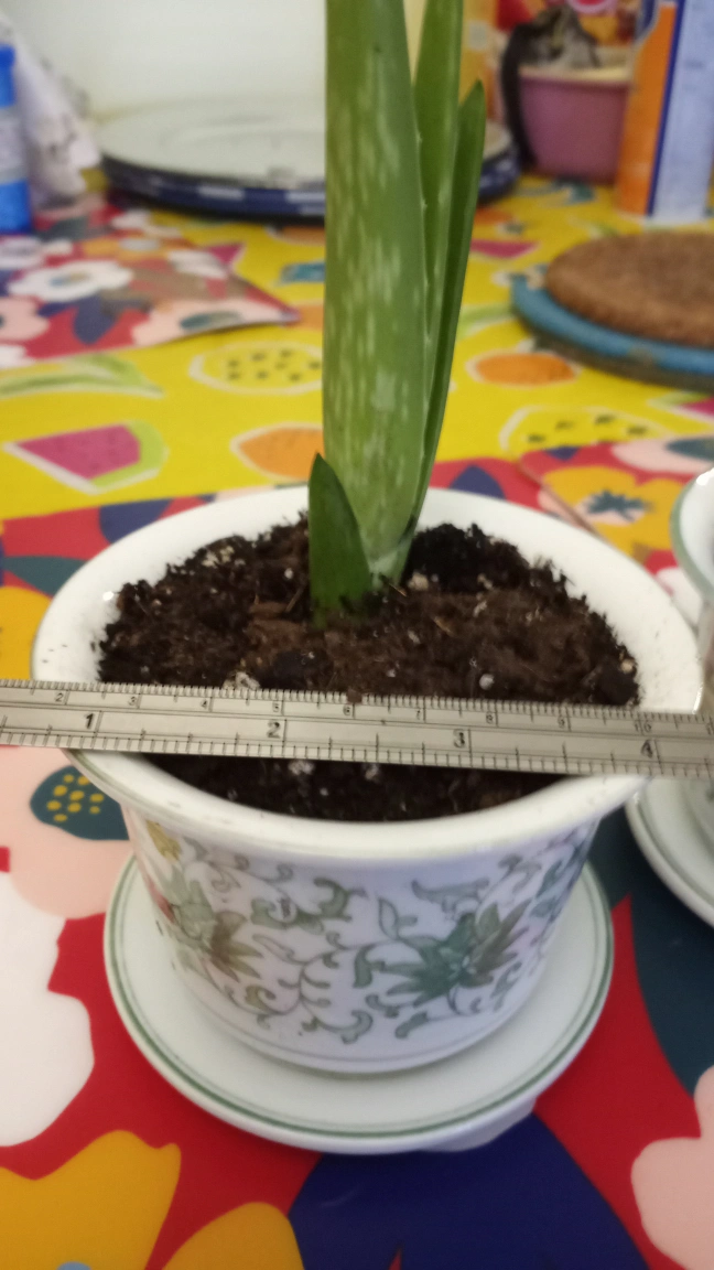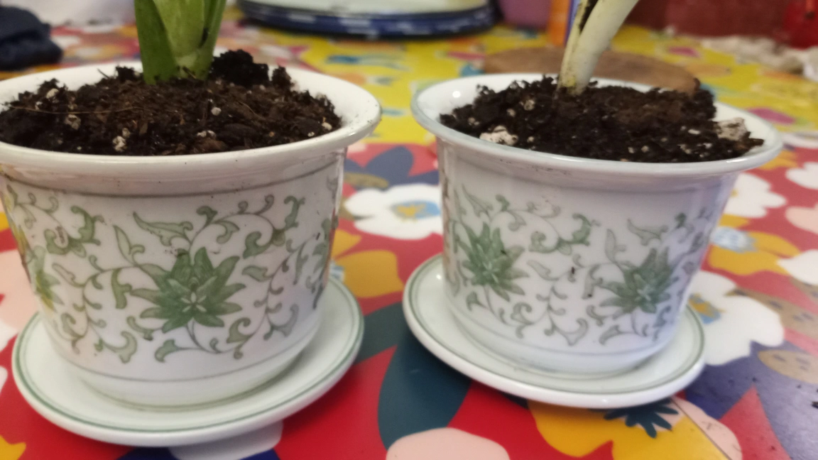 Two aloe vera plants in white pots with saucers. Plants are approximately 5 inches tall.
