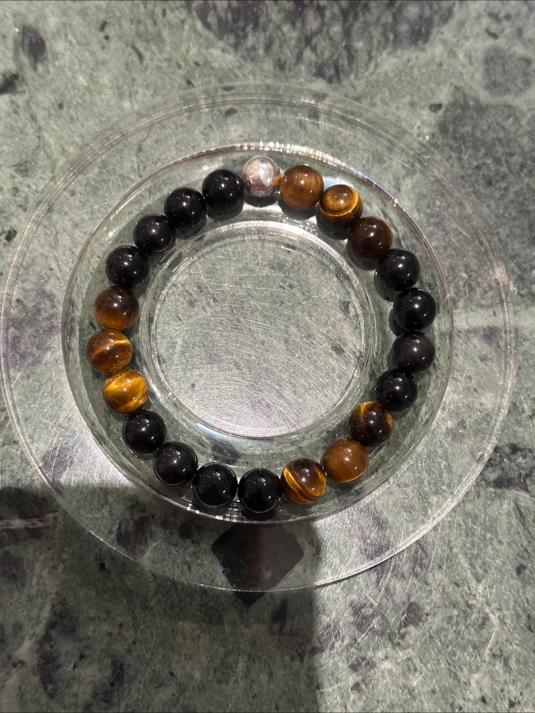 This bracelet features alternating gemstone beads of tiger eye and black obsidian. It has a single metallic bead and a stretchy cord.
