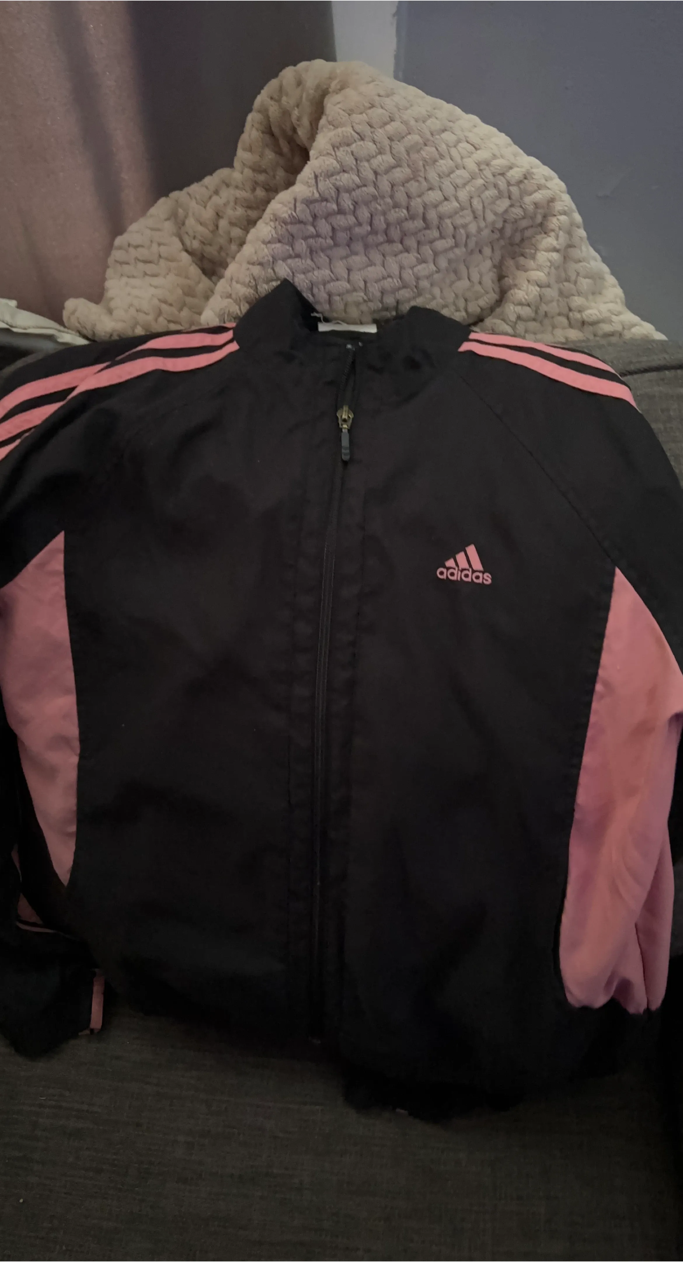 This is a black Adidas track jacket with pink accents. Size medium. It features the classic Adidas stripes on the sleeves and a full zip closure. It's made for athletic wear.