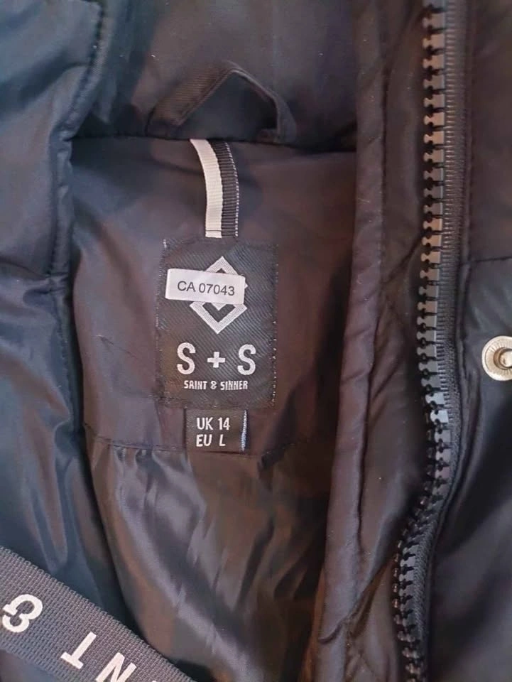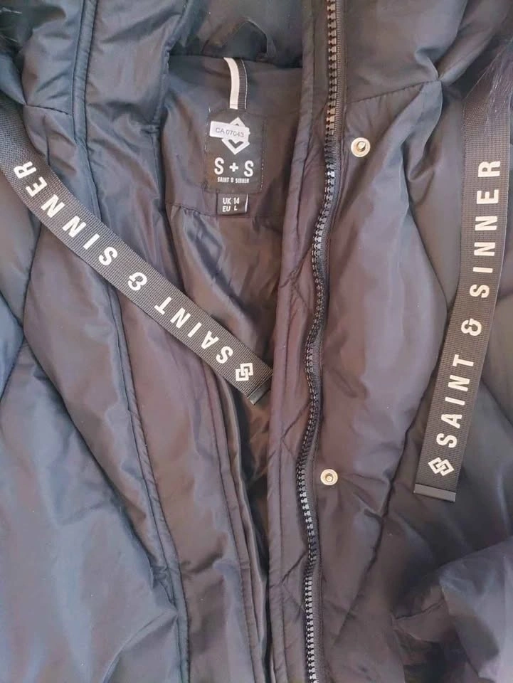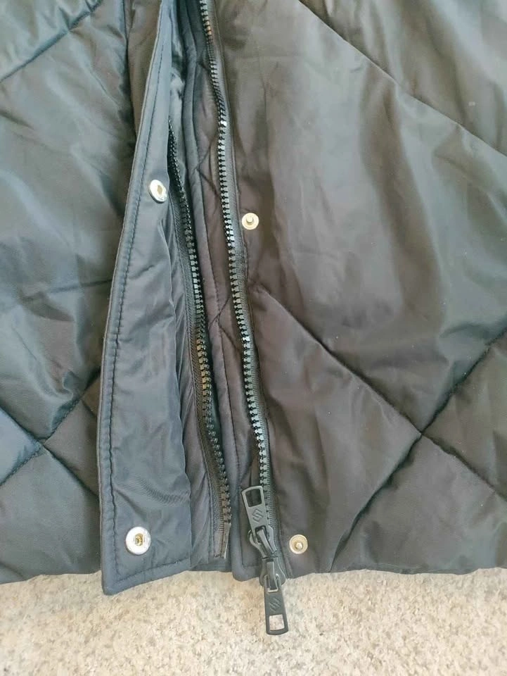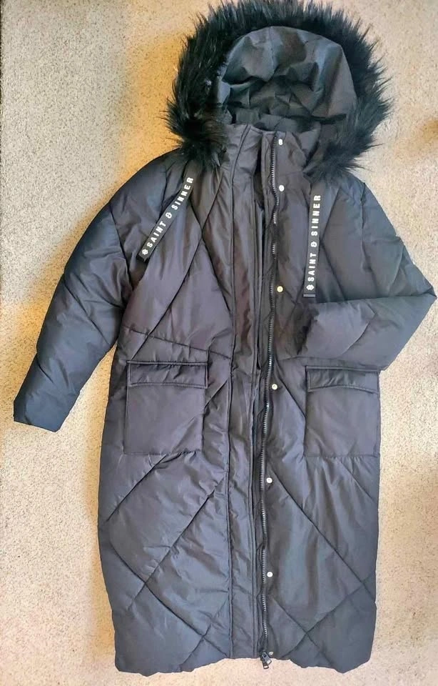 Oversized long fit with a full zip closure and 2 side pockets. Features a funnel neck with a furry hood, cuffed fabric sleeve hems, and is quilted padded for warmth.