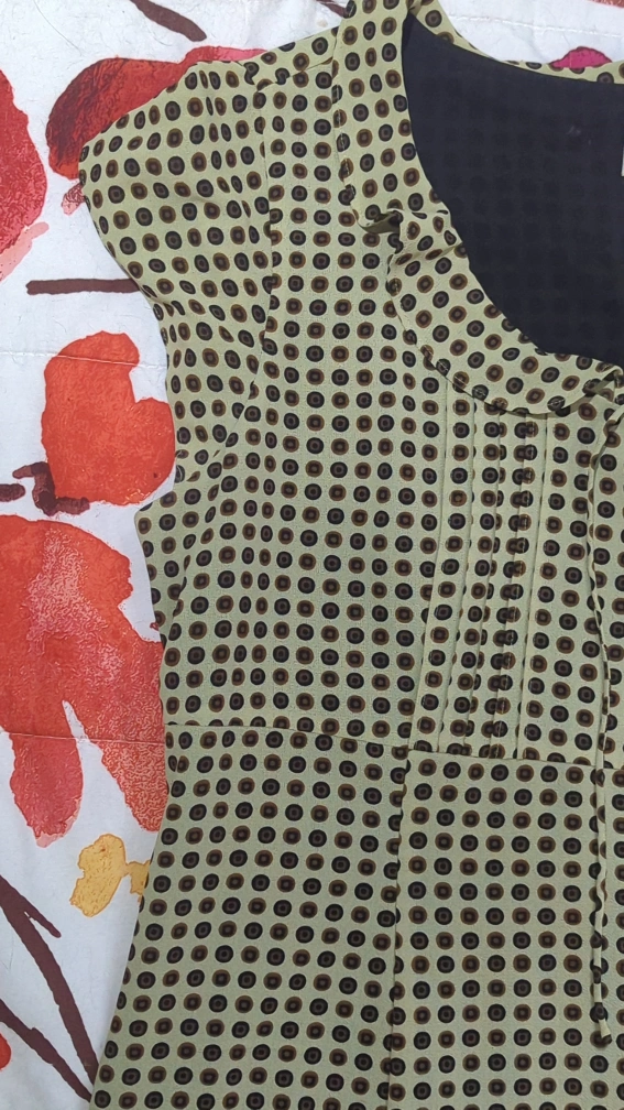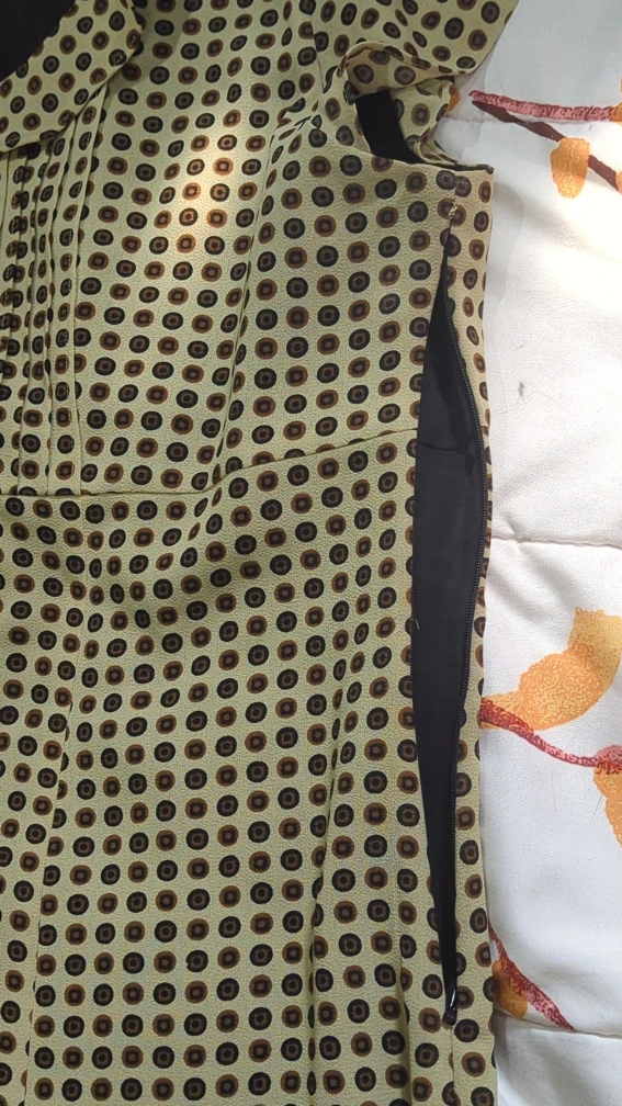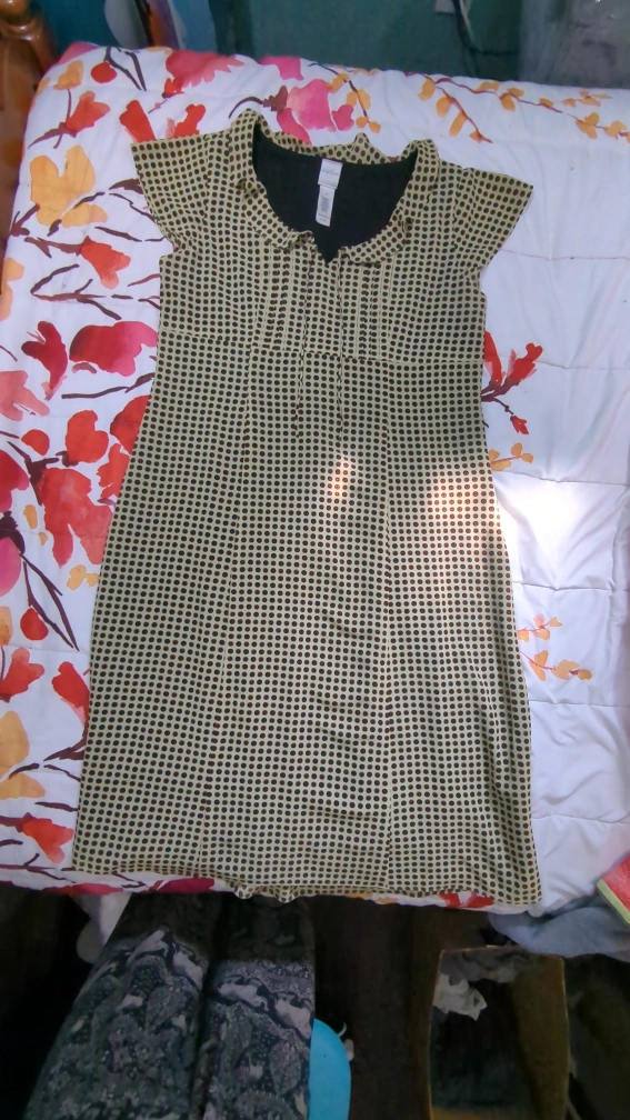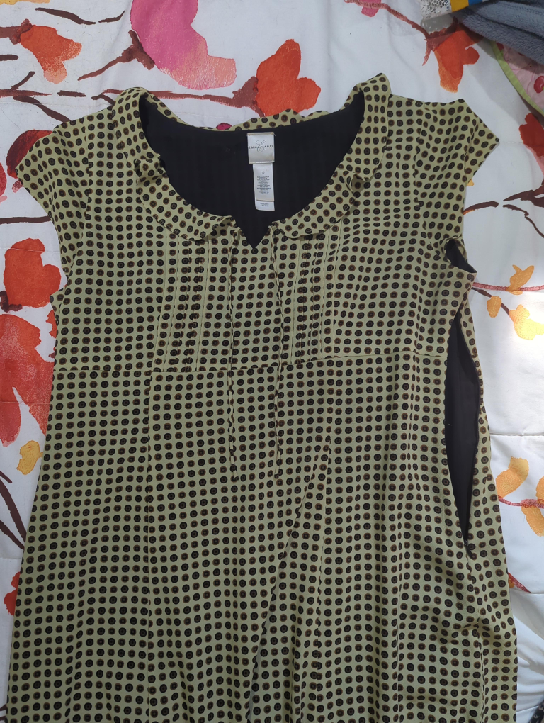 Selling an Emma & Carol dress in size XL. It features a unique polka dot pattern in shades of beige and brown, complemented by a black lining. Perfect for a casual or semi-formal occasion! Side zipper for dressing convenience.