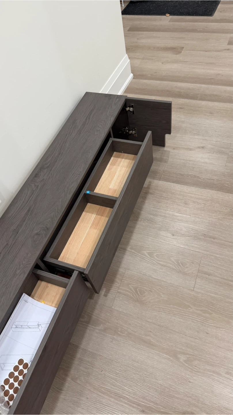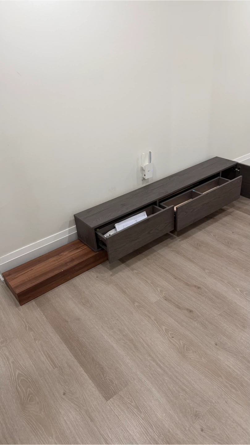 Selling a dark brown TV console. It has a sleek design and offers great storage with its built-in drawers. Perfect for any living room setup!