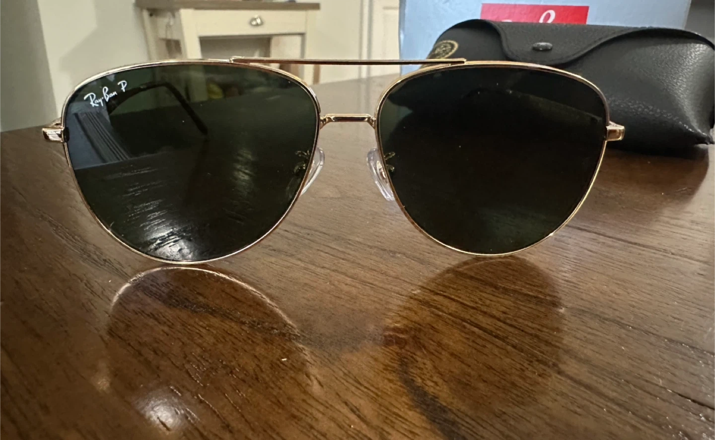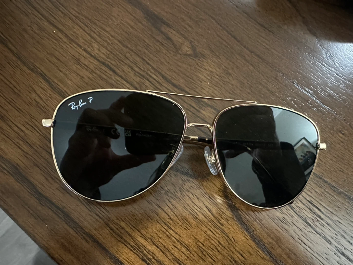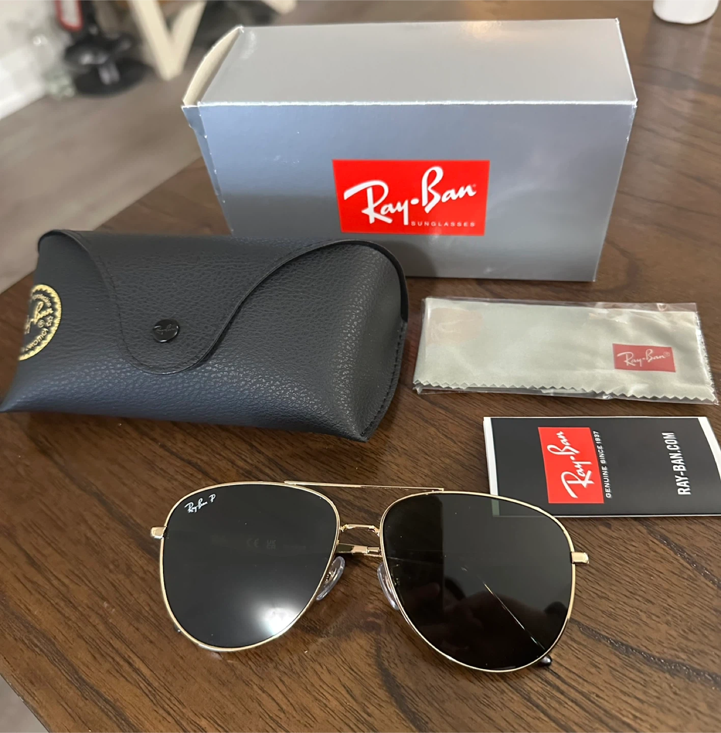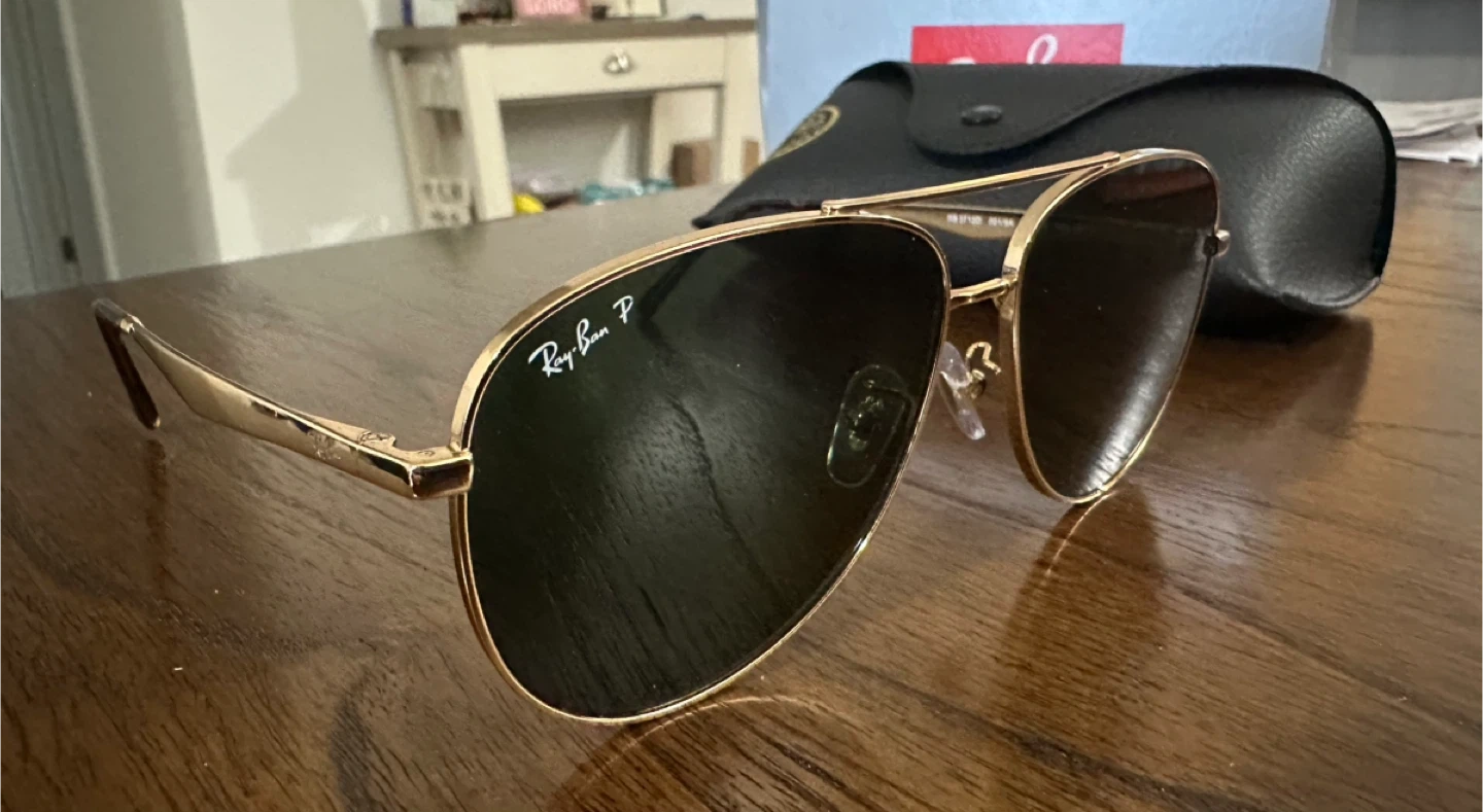 Ray-Ban aviator sunglasses with polarized lenses. This pair comes with the original box, case, cleaning cloth, and authenticity card. Great for protecting your eyes from the sun!