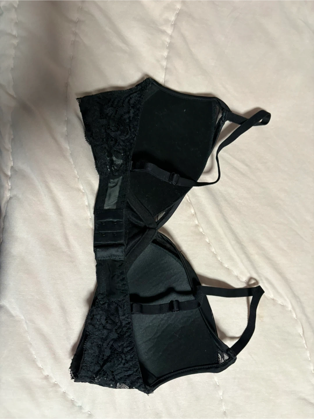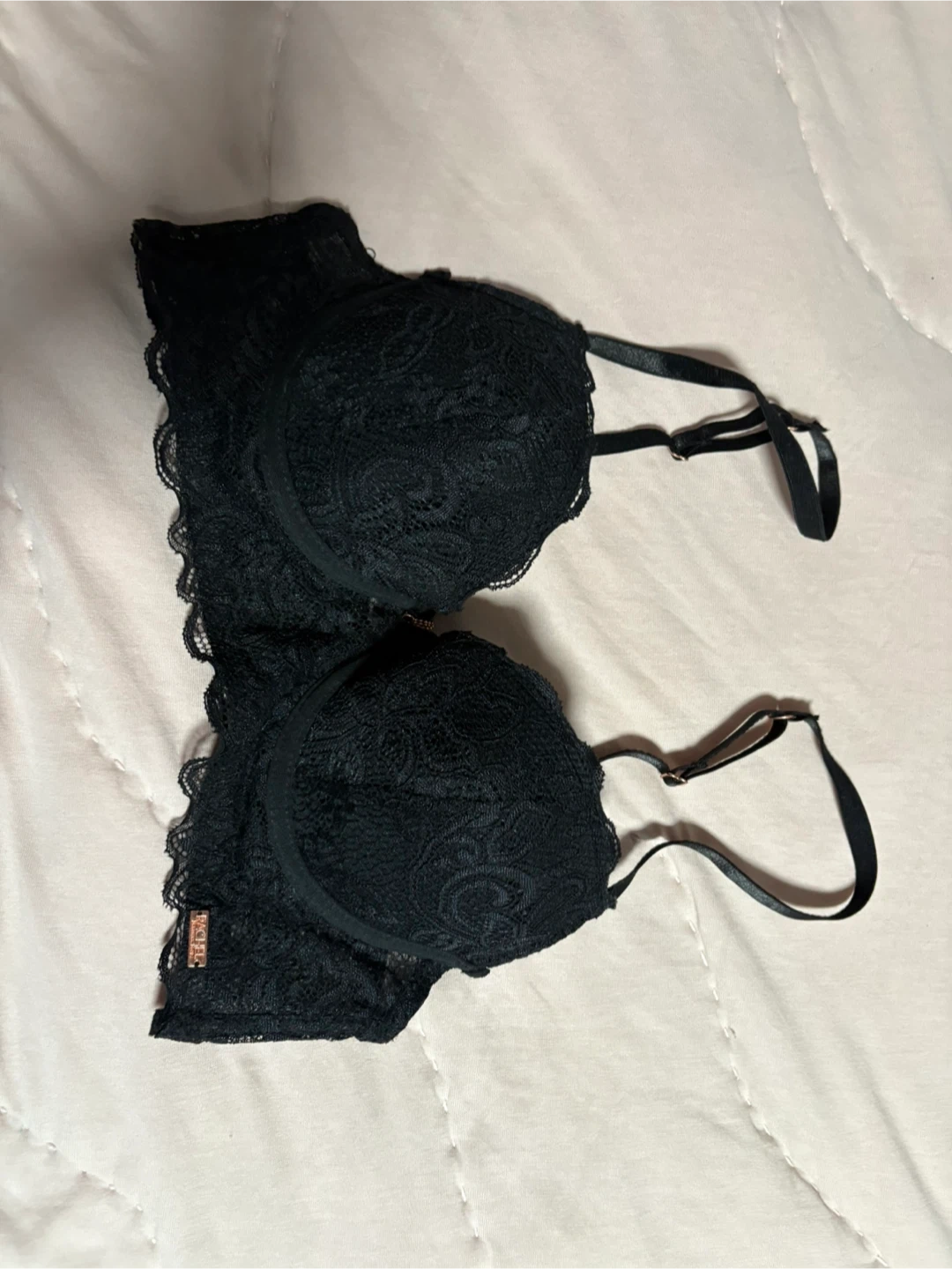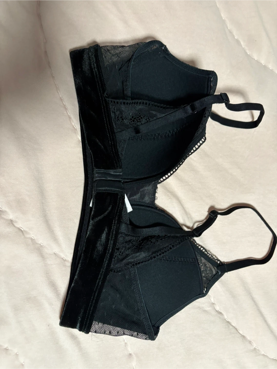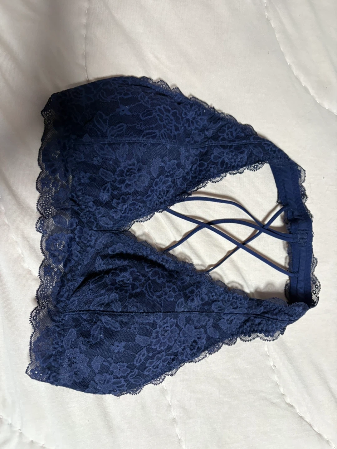 Comfortable navy blue lace bralette. It features a criss-cross strap detail in the back and scalloped lace trim. Soft lace material.