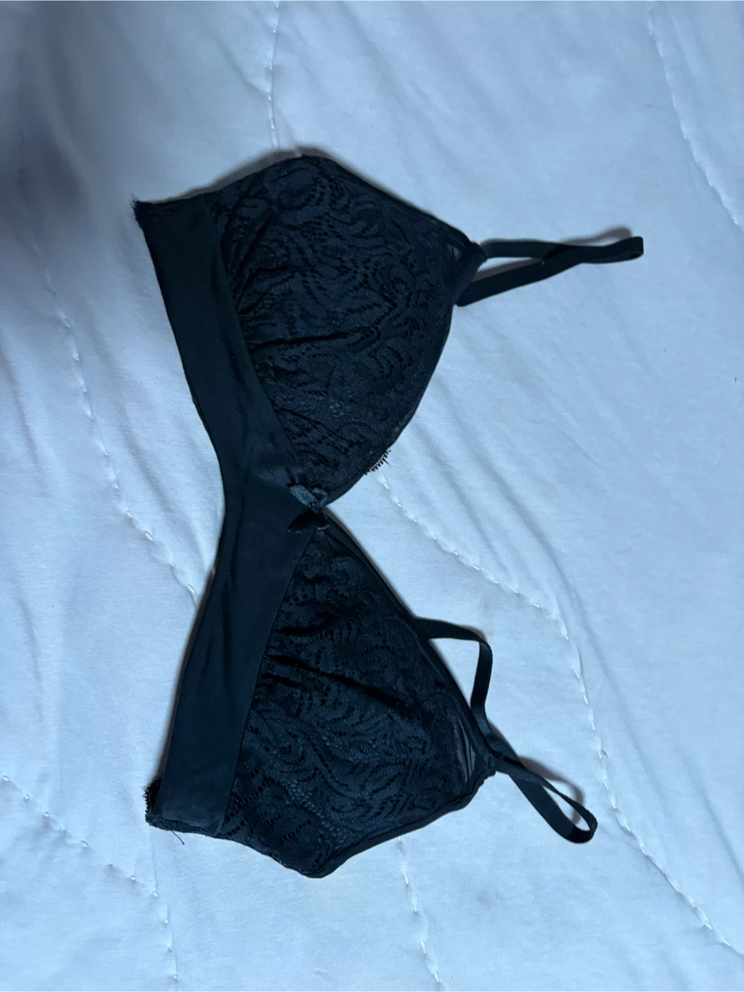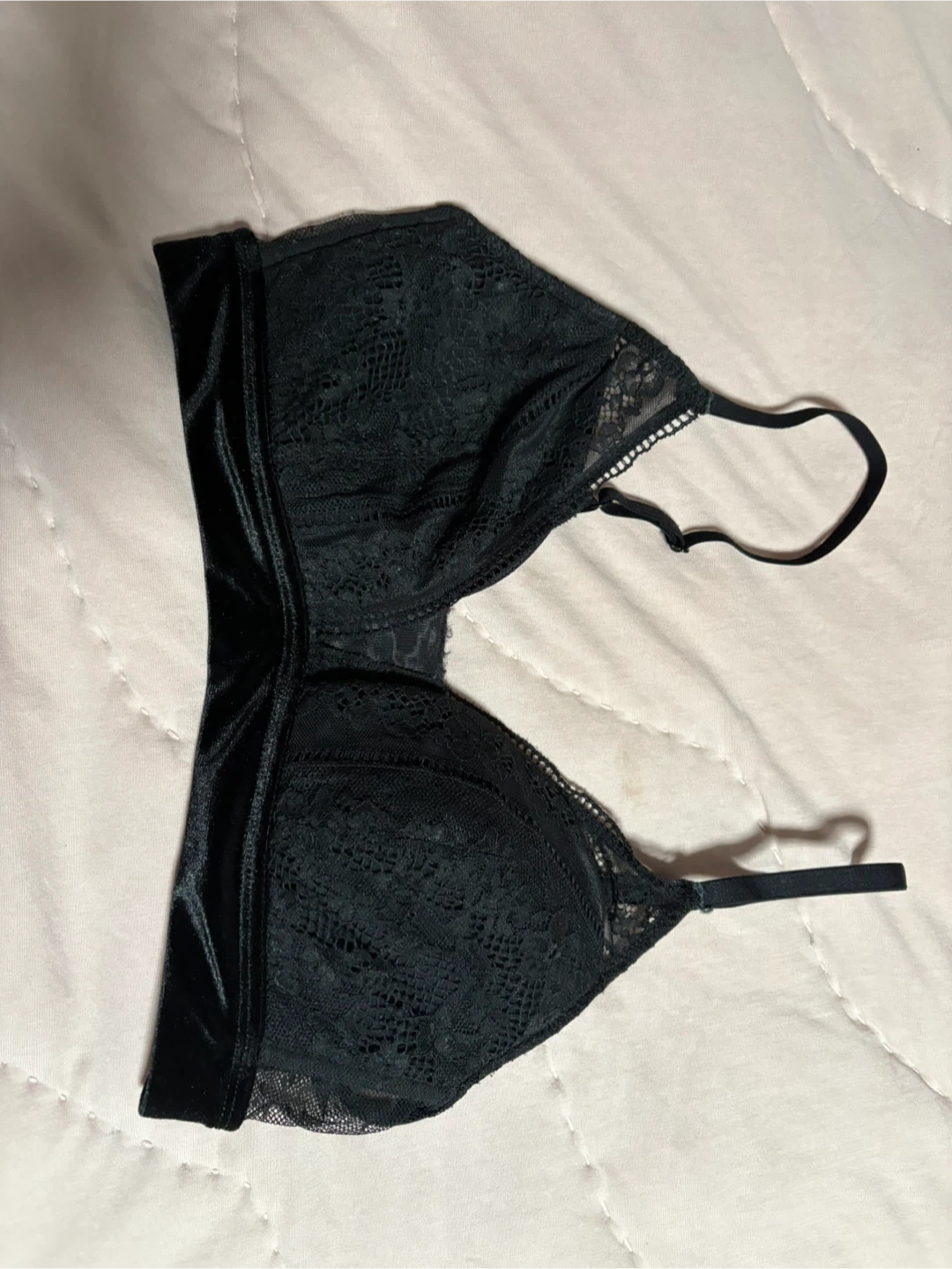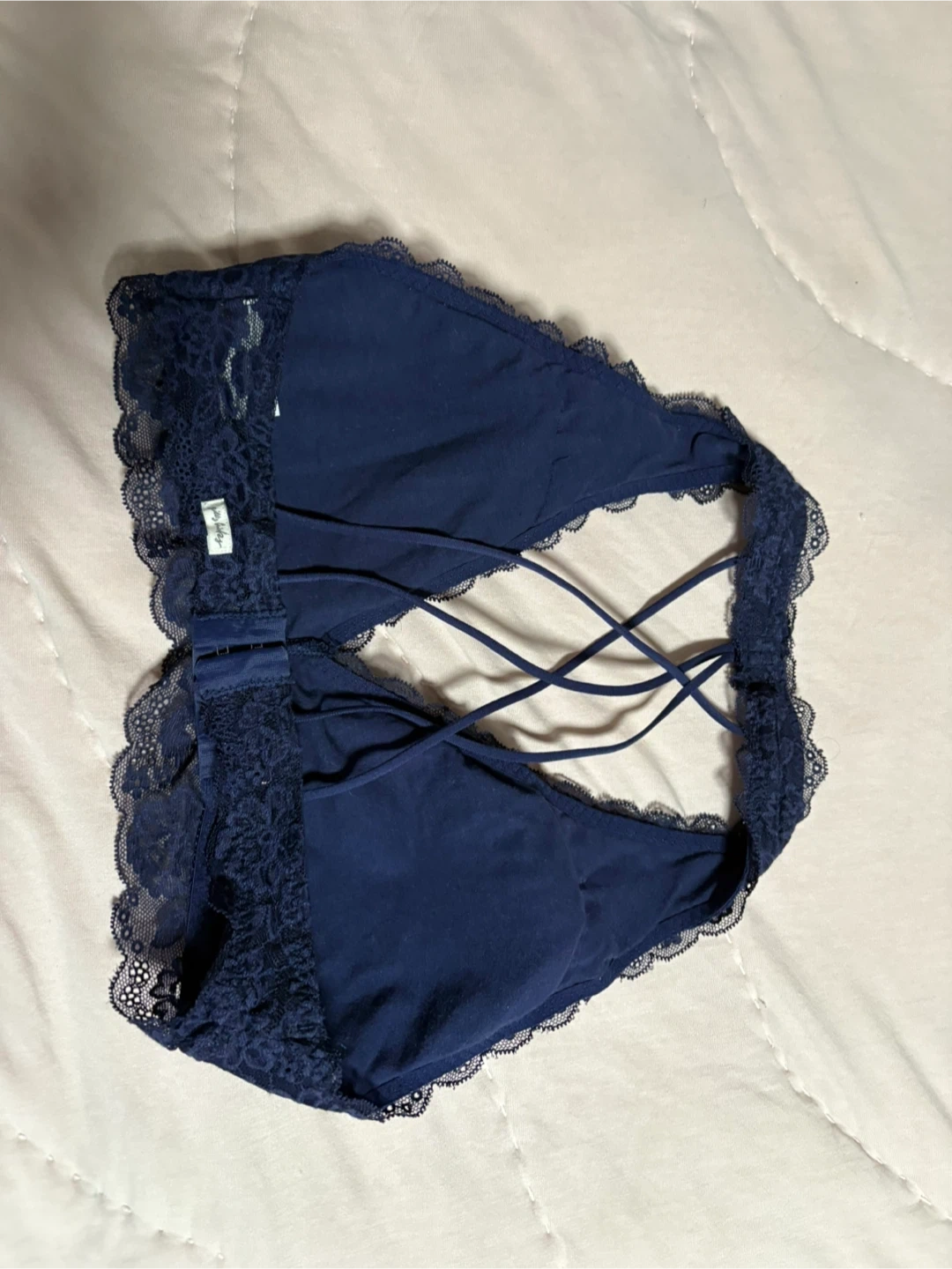 Comfortable navy blue lace bralette. It features a criss-cross strap detail in the back and scalloped lace trim. Soft lace material.