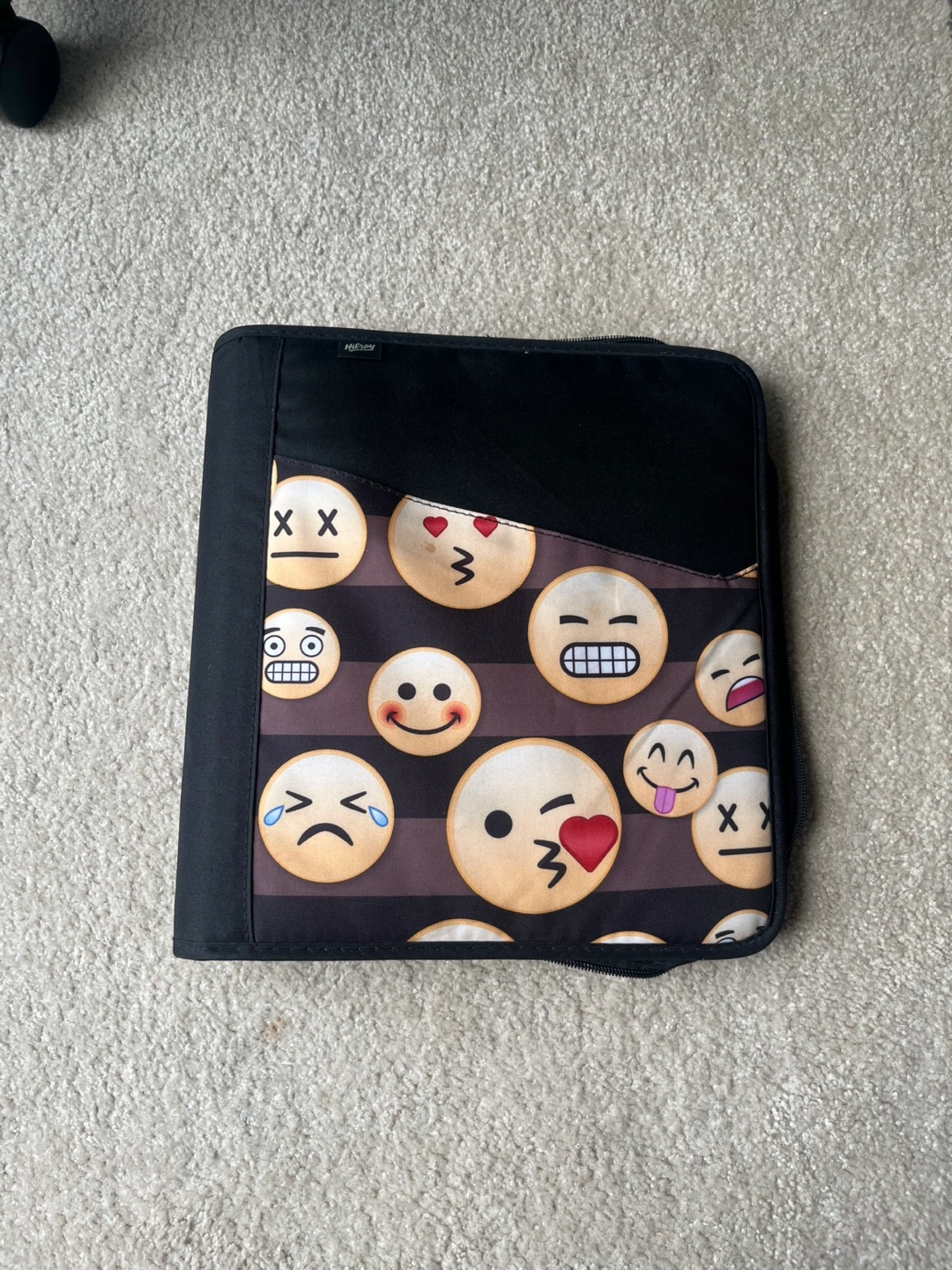 98Case-it emoji zipper binder! It's in great shape and ready to keep your papers organized. It features a fun emoji design on the front. Perfect for school or work!