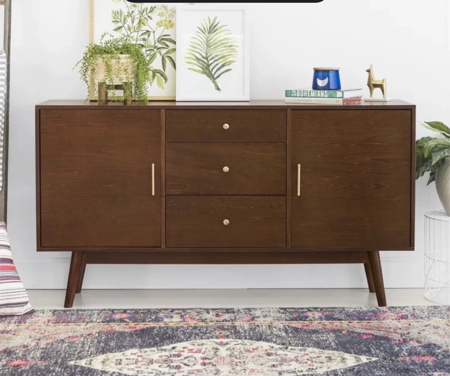 Stylish mid-century modern sideboard has rich walnut wood finish with gold-toned hardware. Piece features three spacious center drawers and two large side cabinets for plenty of storage. Tapered wooden legs give it classic retro look. Used but excellent condition.