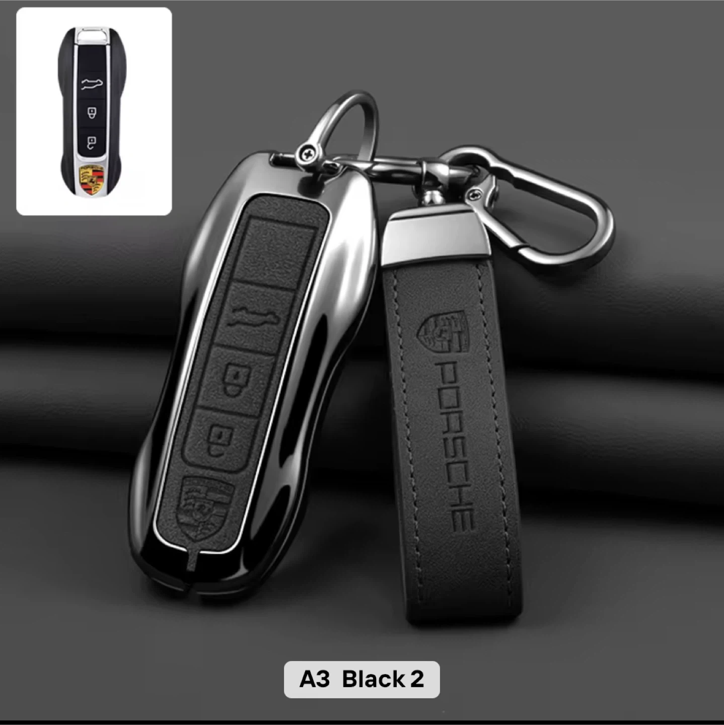 Protect your Porsche key fob with this stylish black leather and metal case. It includes a durable keychain with the Porsche logo. Great for keeping your car keys organized and secure.