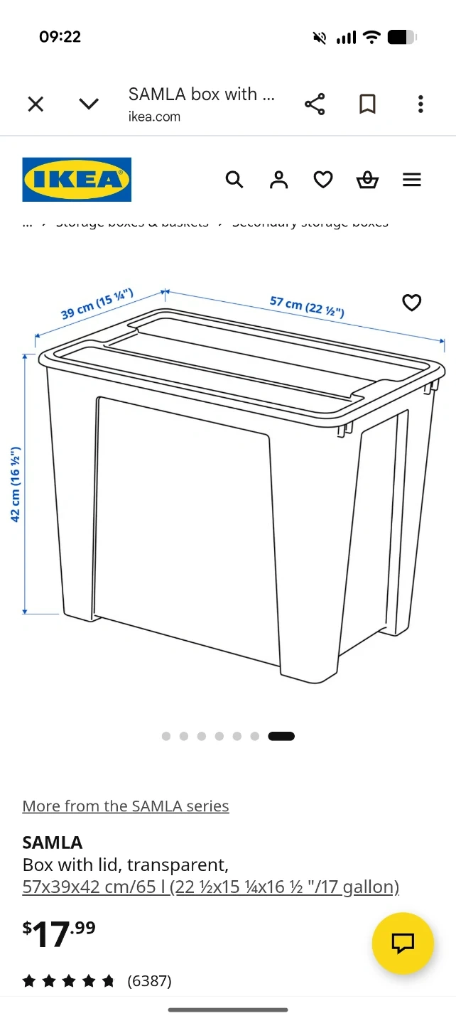 This is an IKEA SAMLA storage box with a lid. It's made of transparent plastic. Dimensions are 57x39x42 cm, with a capacity of 65 L. Selling only because I no longer need it. Original price is 18+tax.