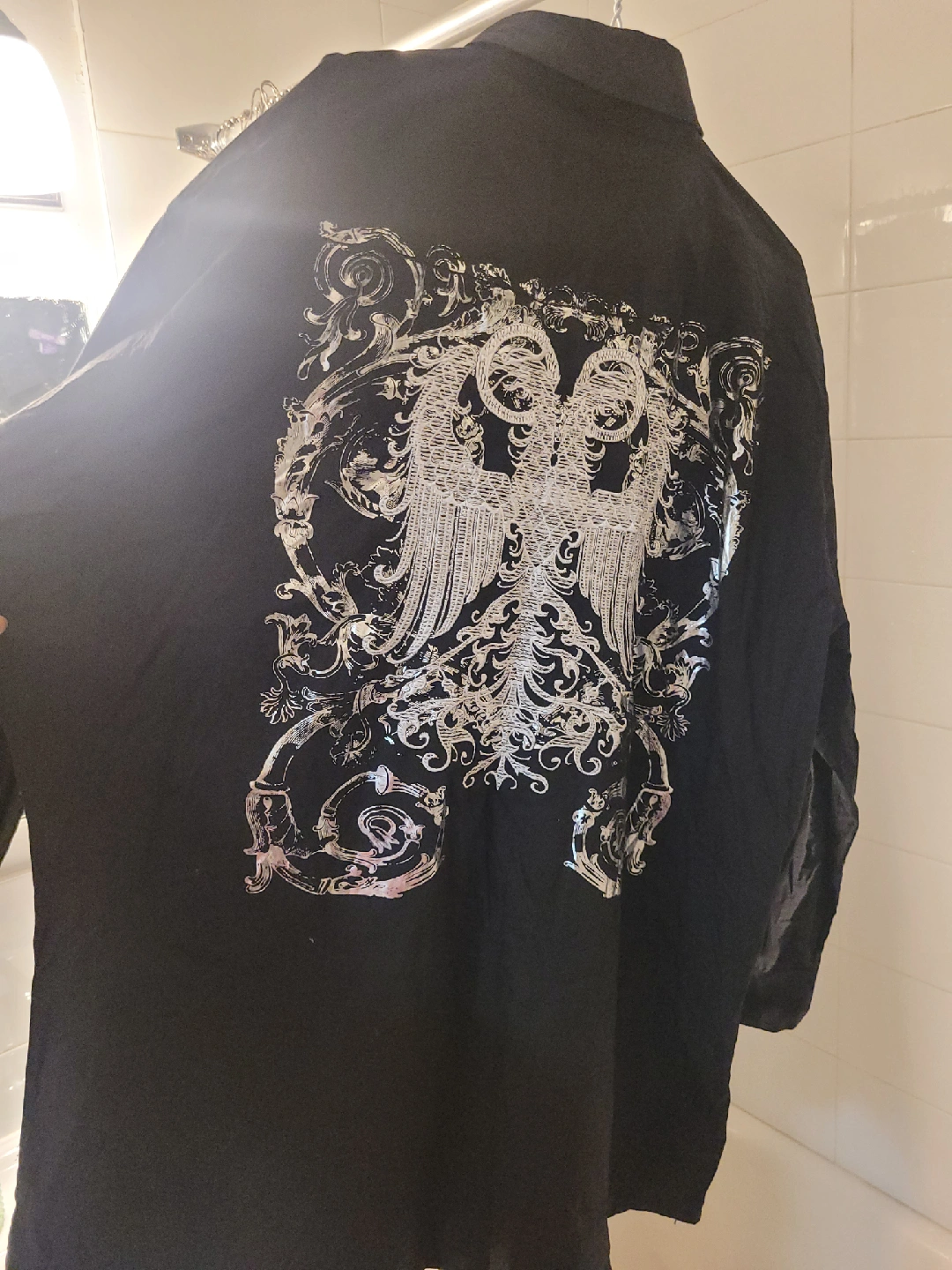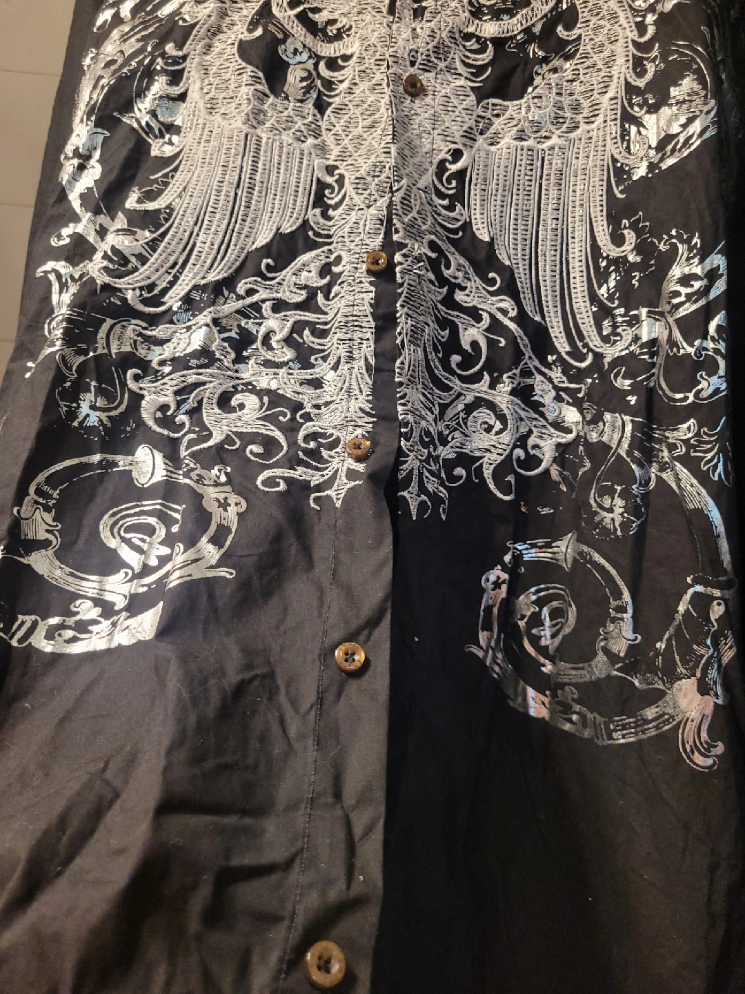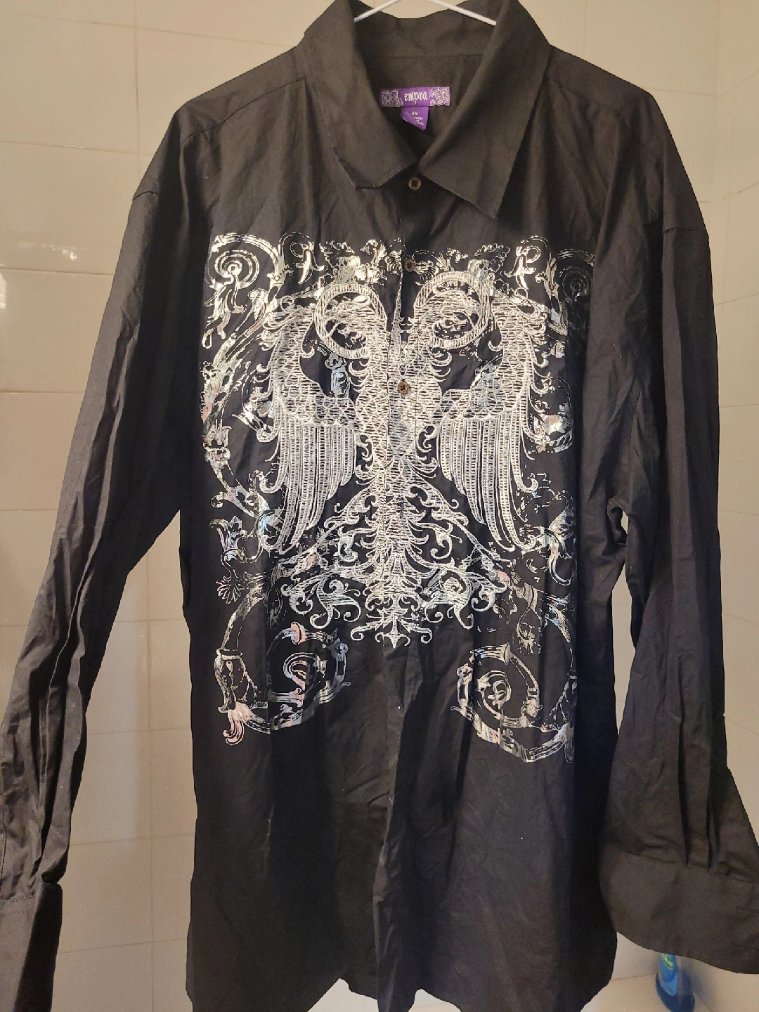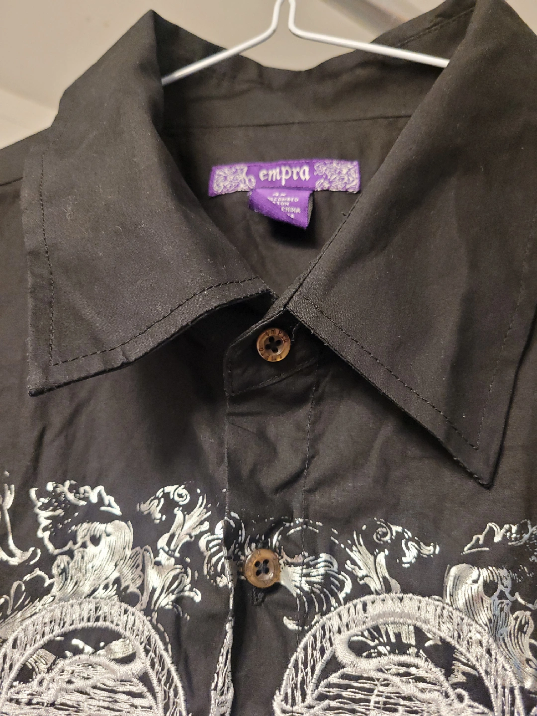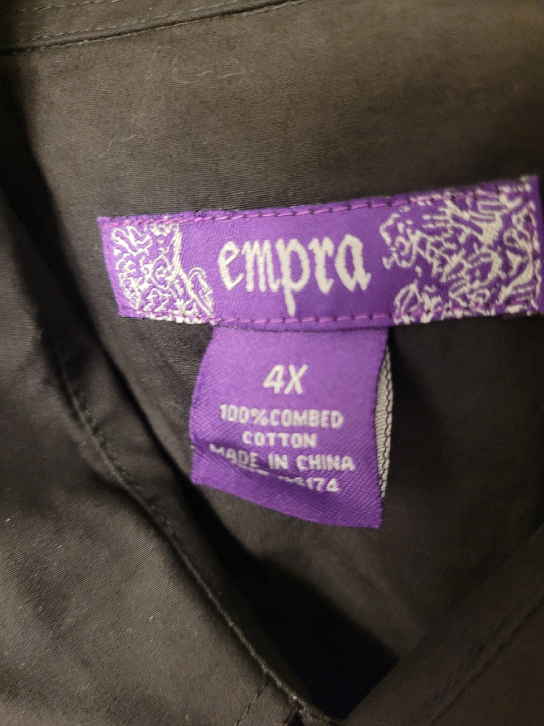 Selling a black button-up shirt from Empra! It's a size 4X and made from 100% combed cotton. Features a unique design on the back. Perfect for a casual or dressed-up look!