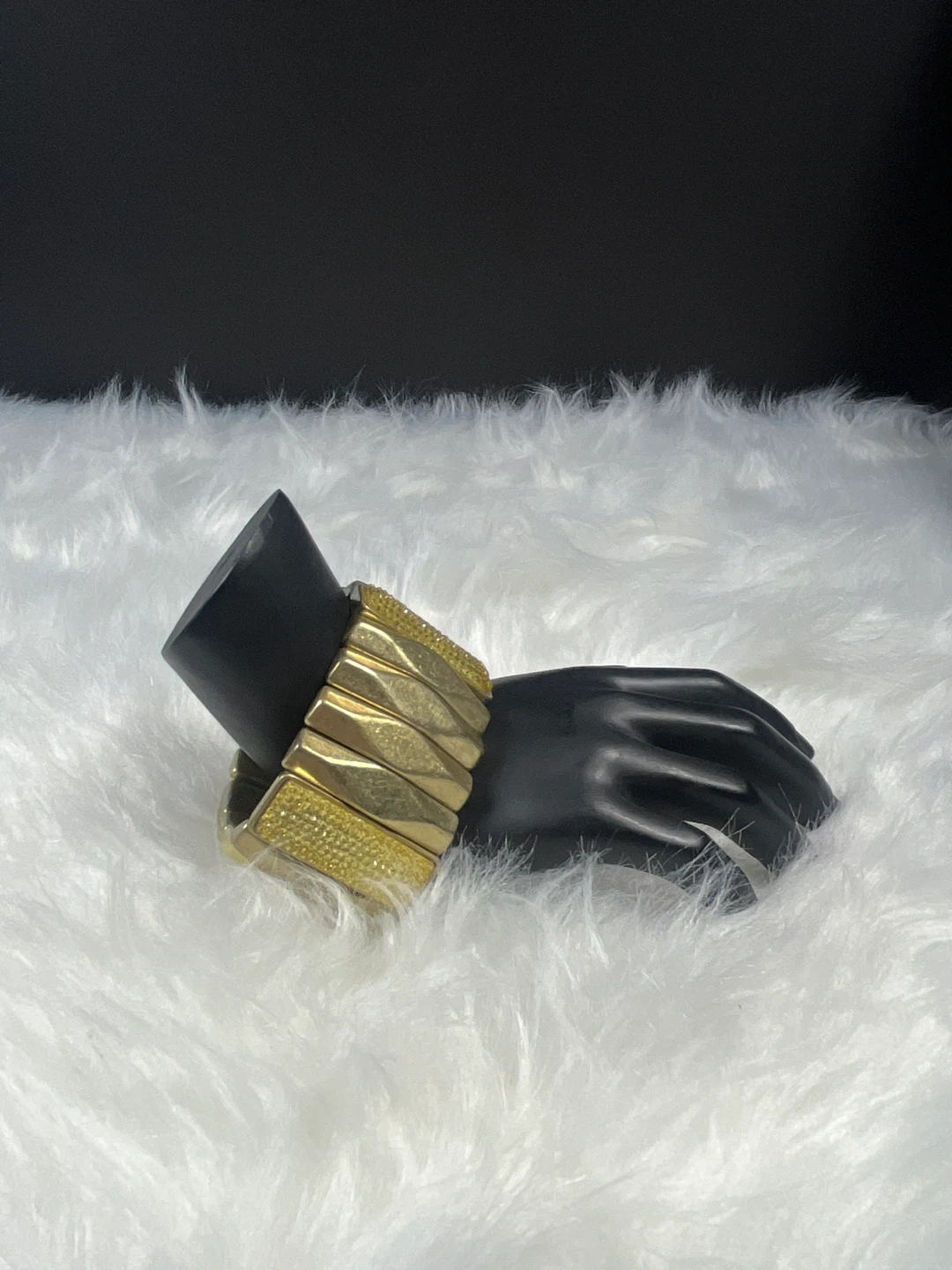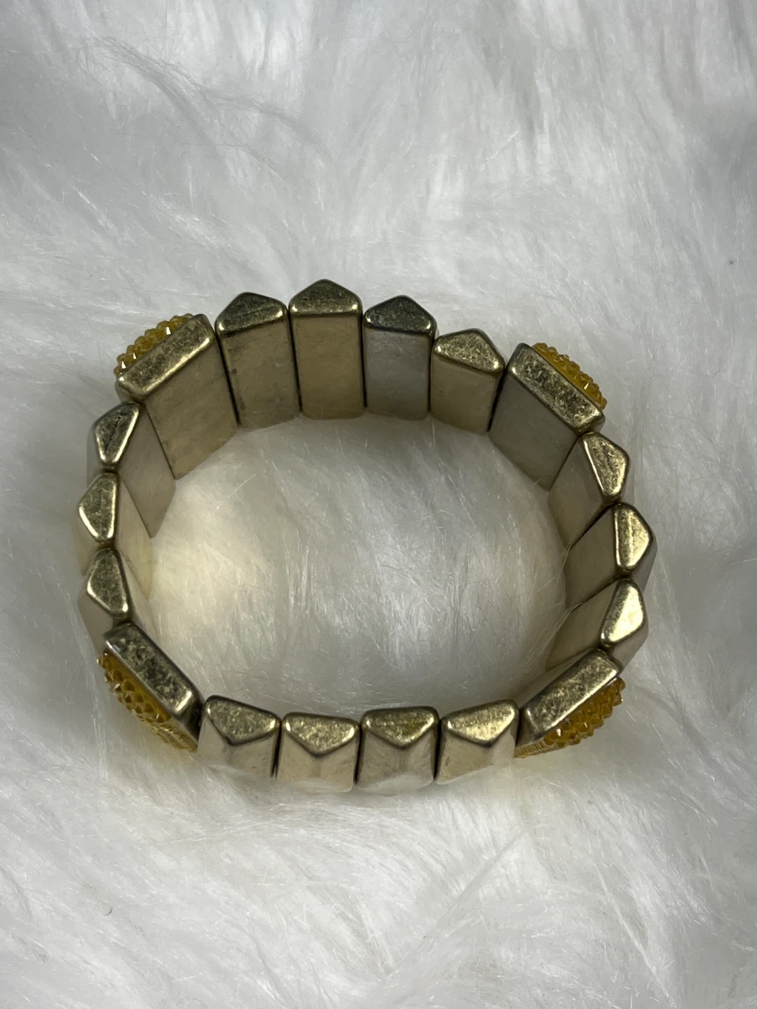 This gold-tone stretch bracelet features a series of articulated links with a textured, sparkling accent on each end. It's designed to fit comfortably and add a touch of glamour to your look. The metallic finish provides a classic shimmer.