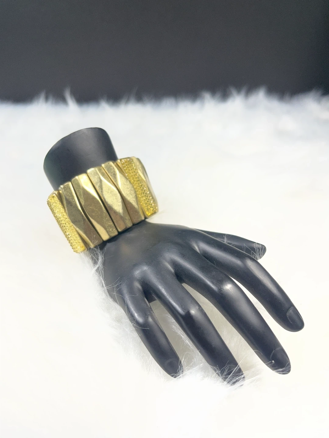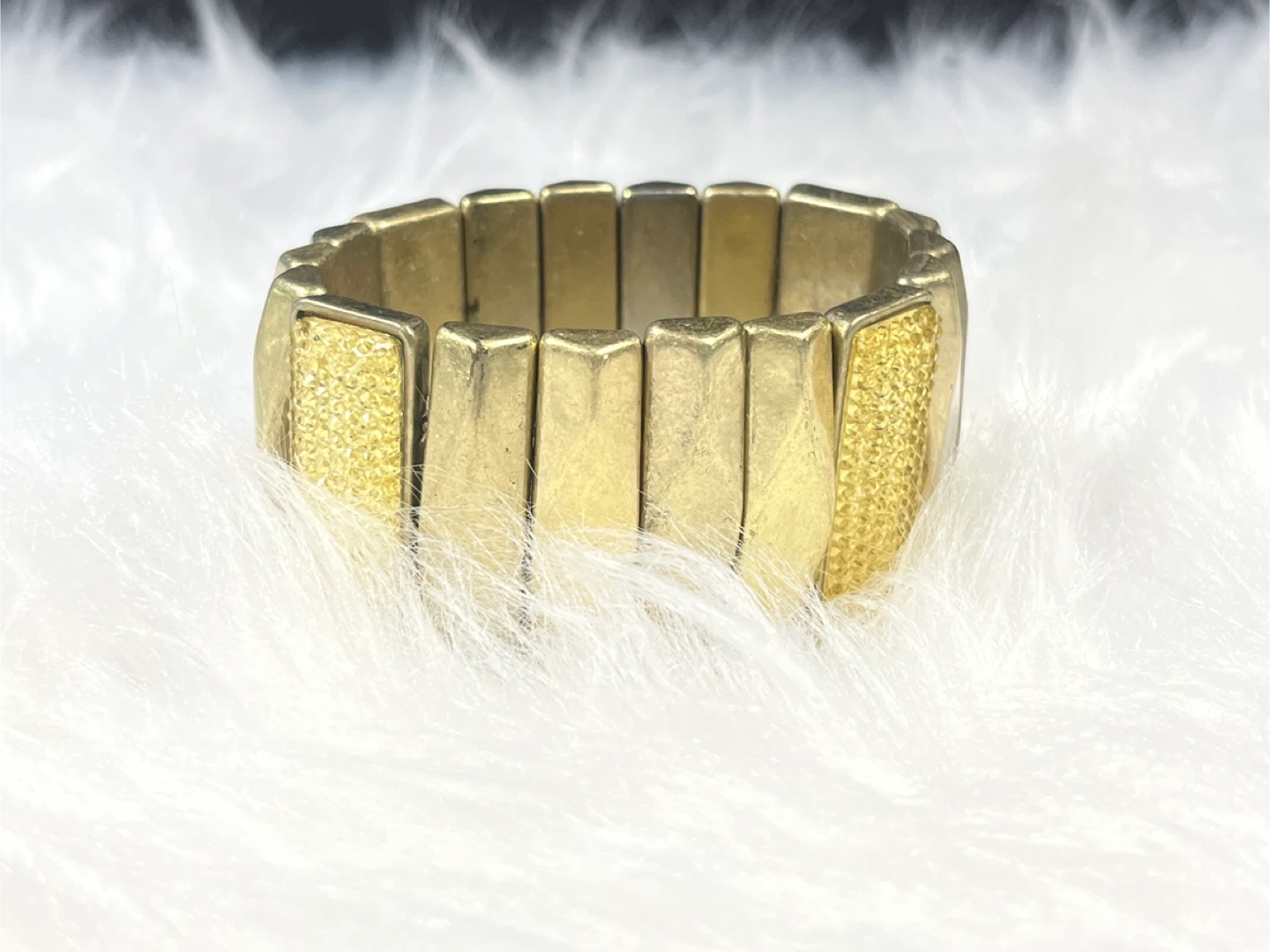 This gold-tone stretch bracelet features a series of articulated links with a textured, sparkling accent on each end. It's designed to fit comfortably and add a touch of glamour to your look. The metallic finish provides a classic shimmer.