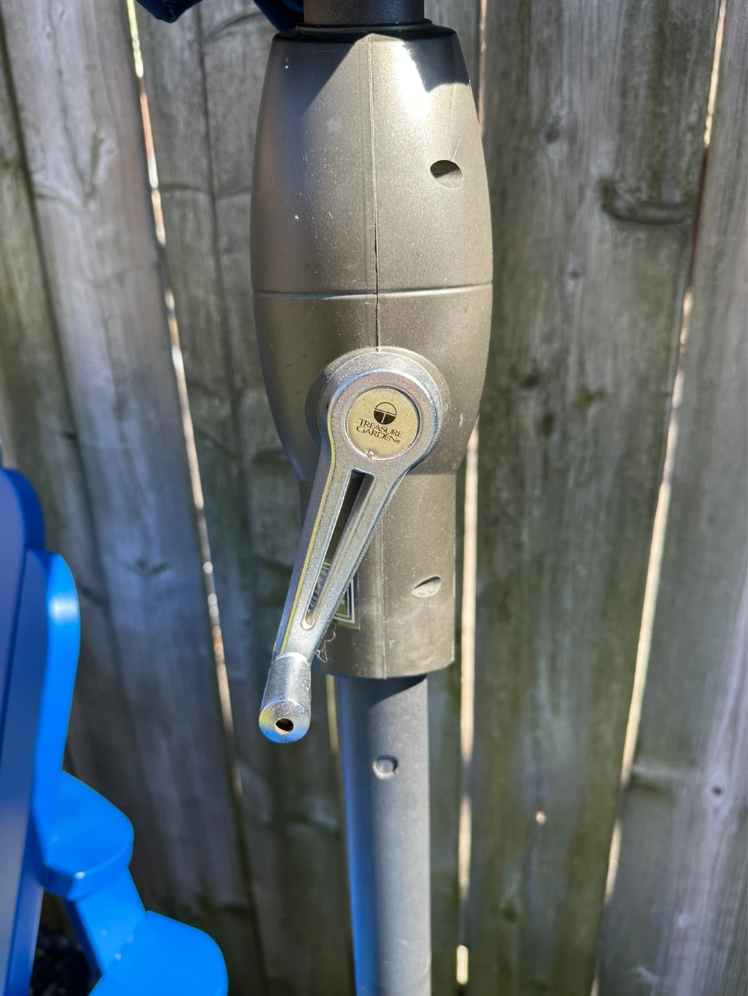 Treasure Garden Octagonal patio umbrella. It features a crank mechanism for easy opening and closing. Measures approximately 9 feet in diameter when open.