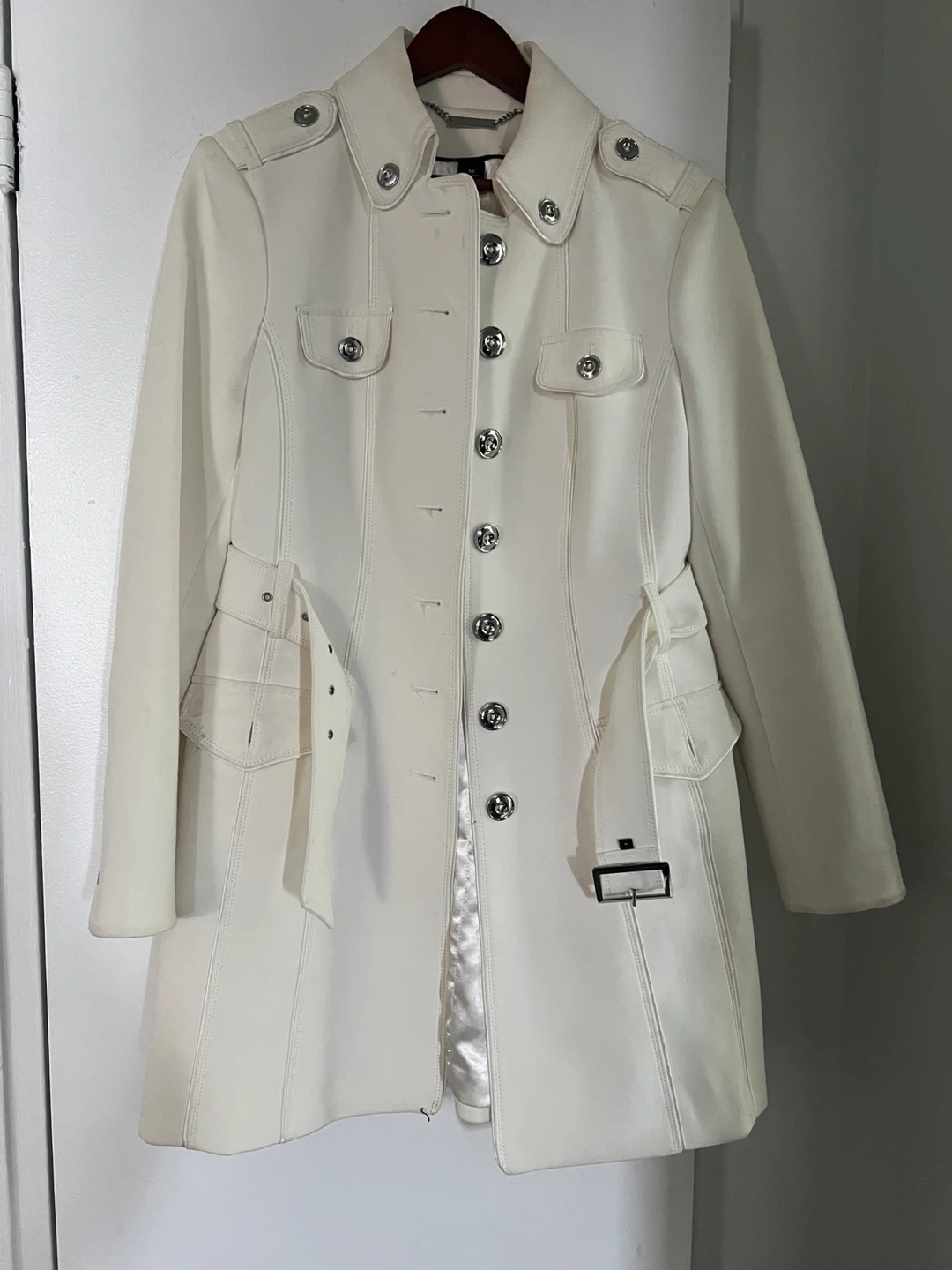 White House Black Market cream trench coat with a satin lining. Features decorative buttons and a belted waist. Size medium.