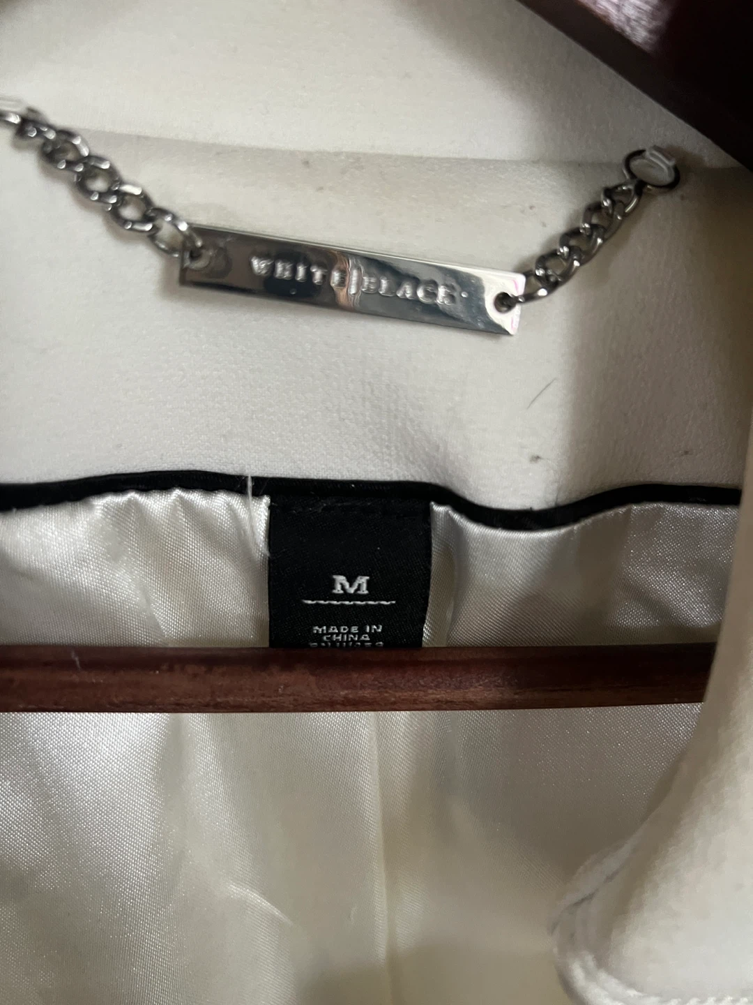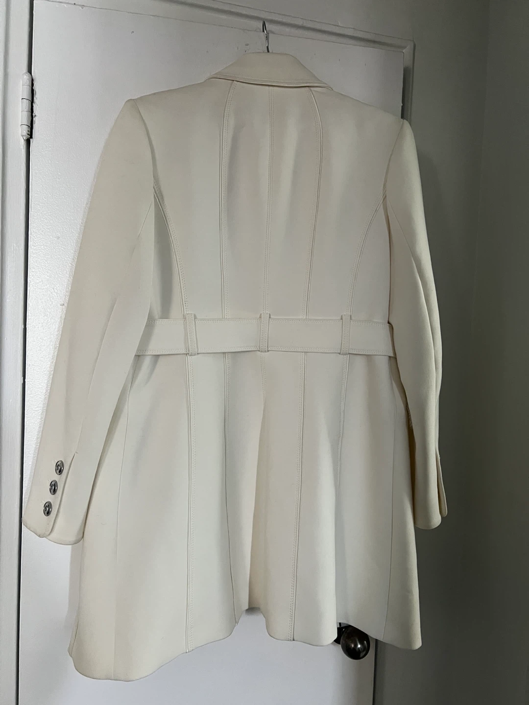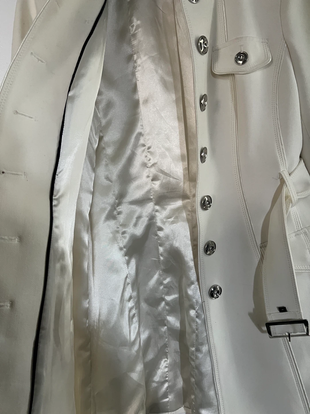 White House Black Market cream trench coat with a satin lining. Features decorative buttons and a belted waist. Size medium.