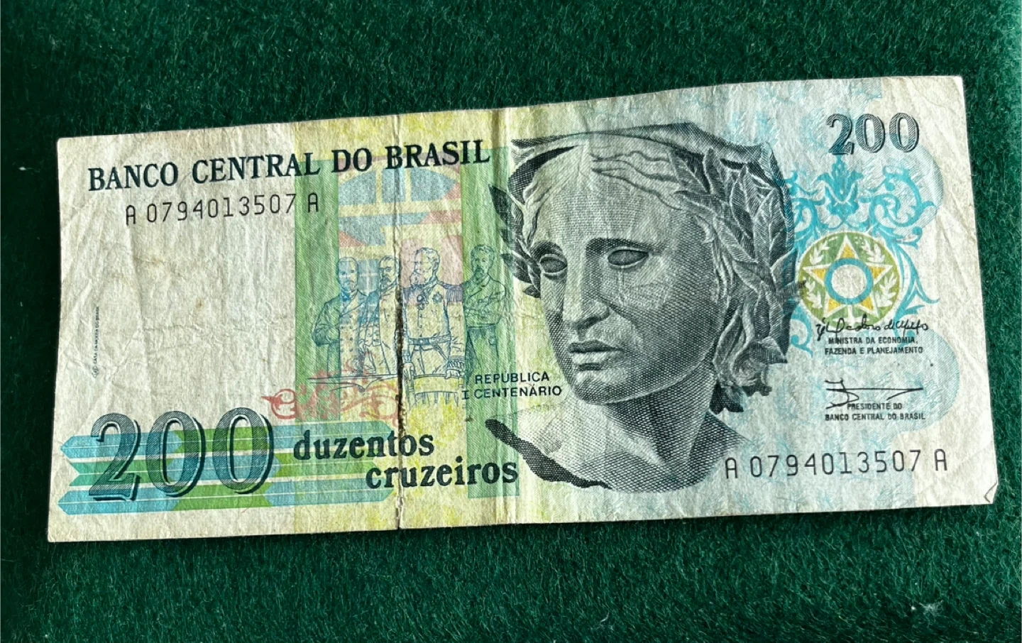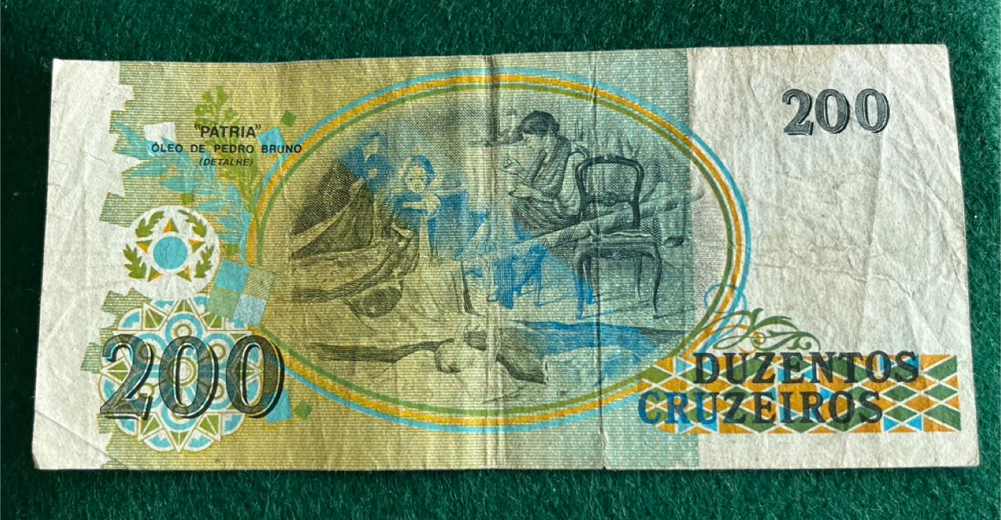 This is a 200 Cruzeiros banknote from Brazil. It features a portrait on one side and a scene on the other. It's a collector's item for numismatists interested in Brazilian currency.