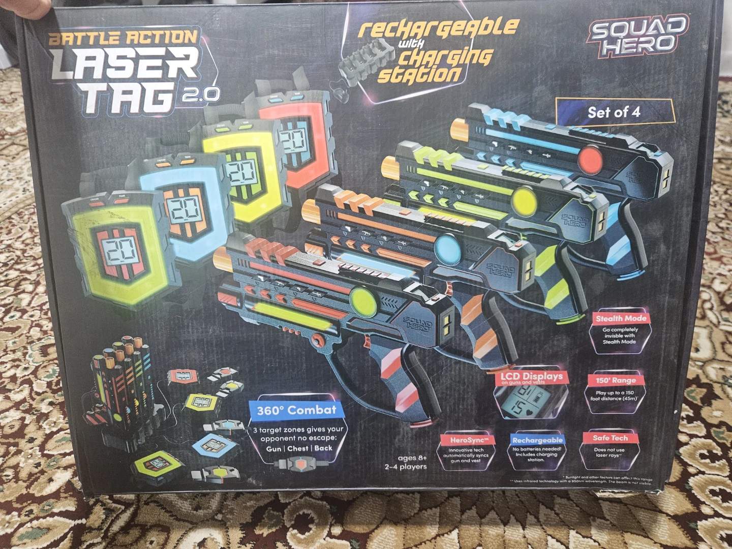 This rechargeable laser tag set includes 2 blasters and 2 vests for thrilling battles. It offers 360° combat with zones that give your opponent no escape. Players can enjoy up to 150 feet of range for exciting indoor or outdoor play. It's recommended for ages 8 and up.