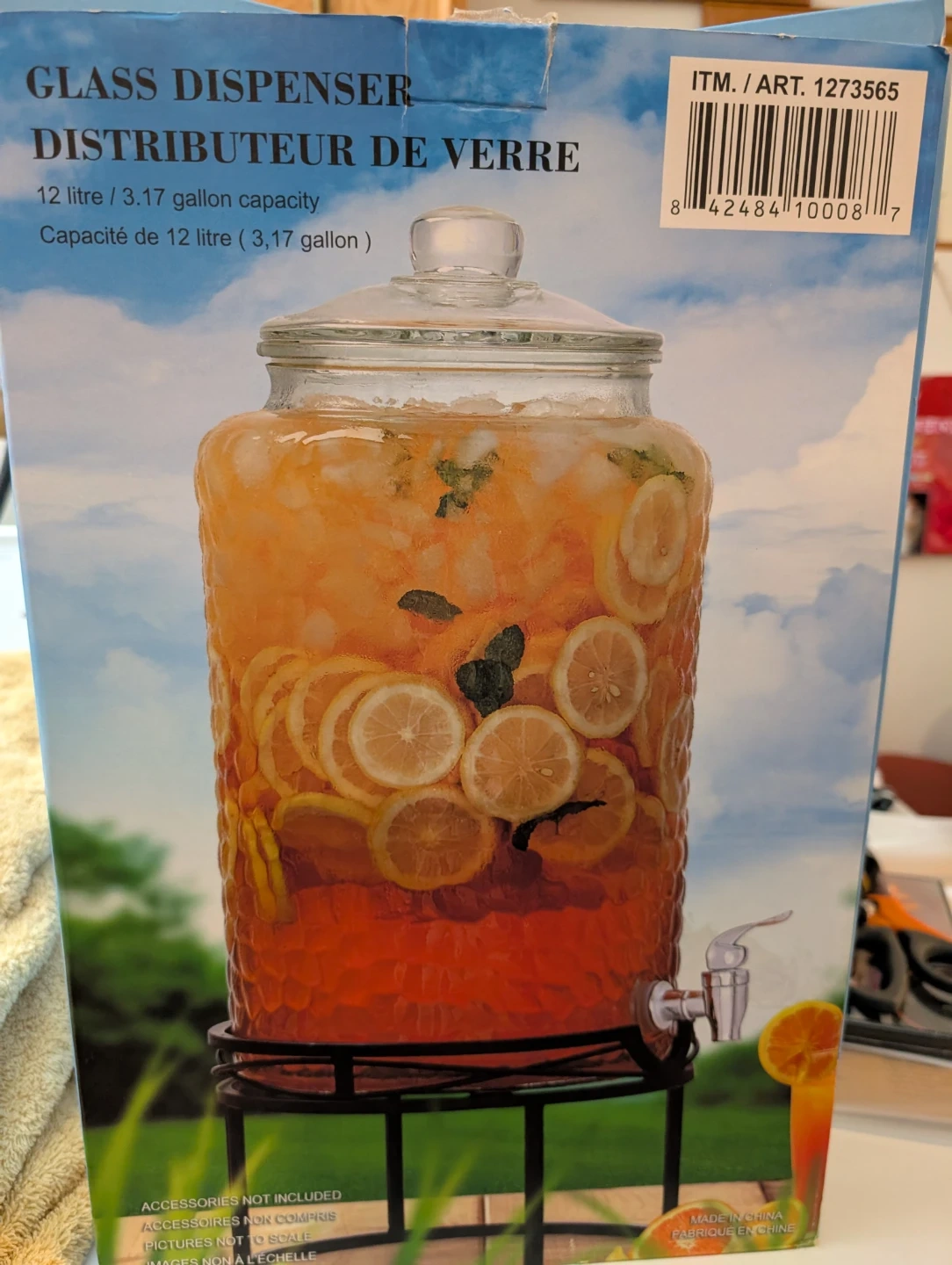 This glass beverage dispenser has a 12 litre capacity. It's perfect for parties or gatherings. The dispenser includes a spigot for easy serving. Used once for cucumber water.