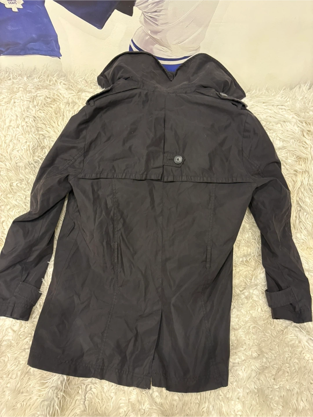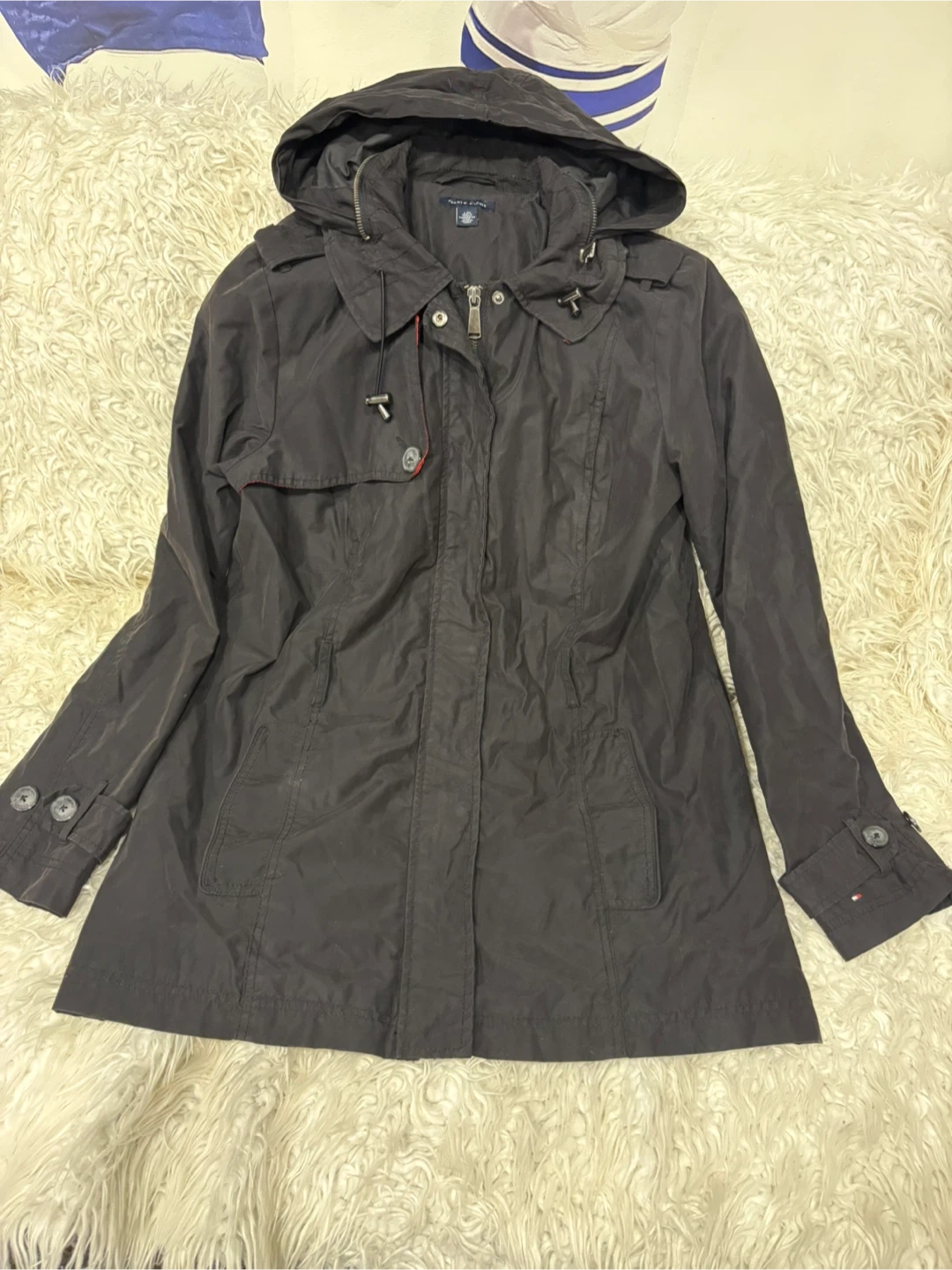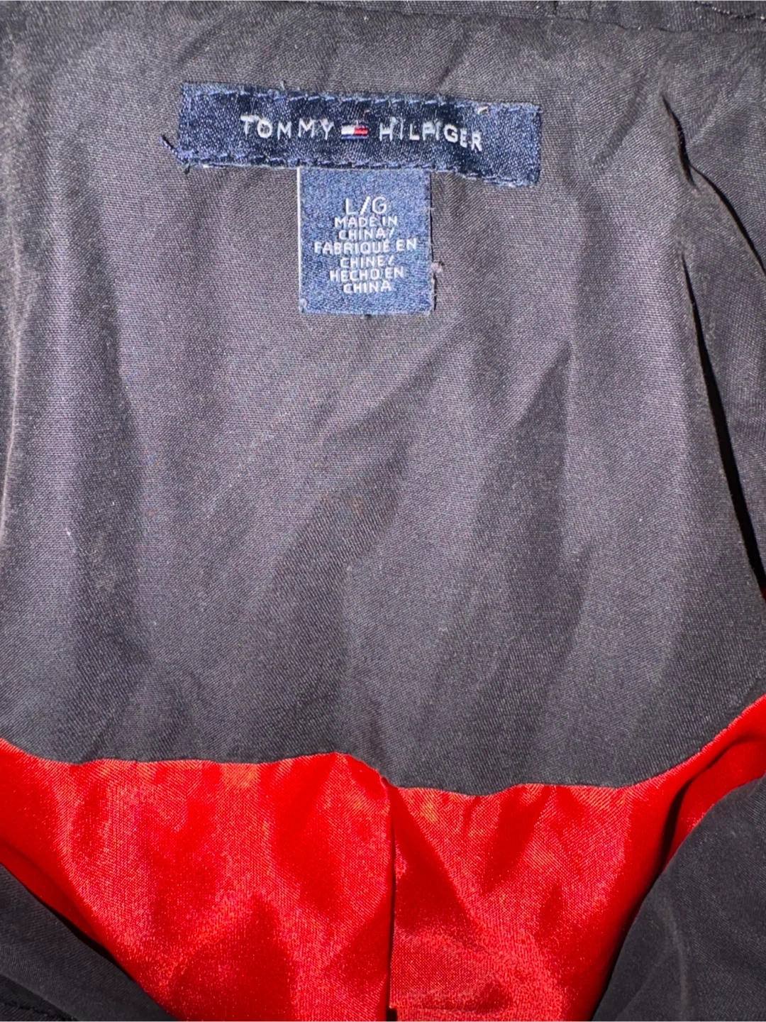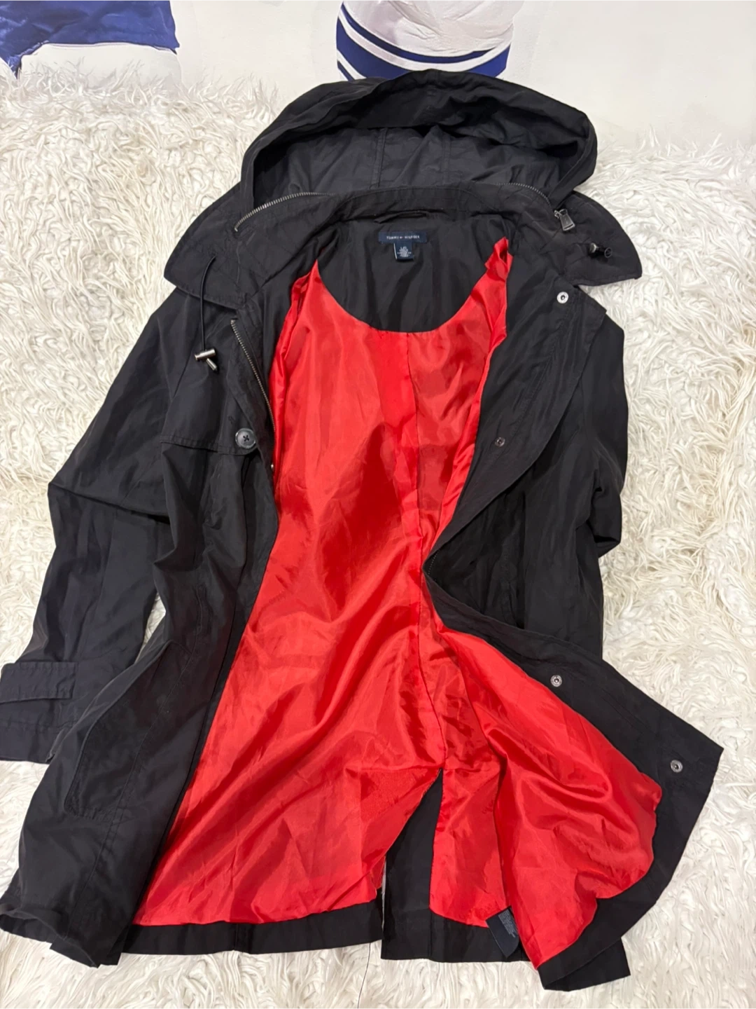 Tommy Hilfiger black hooded fall coat in size large. Has a striking red lining and is in great condition!