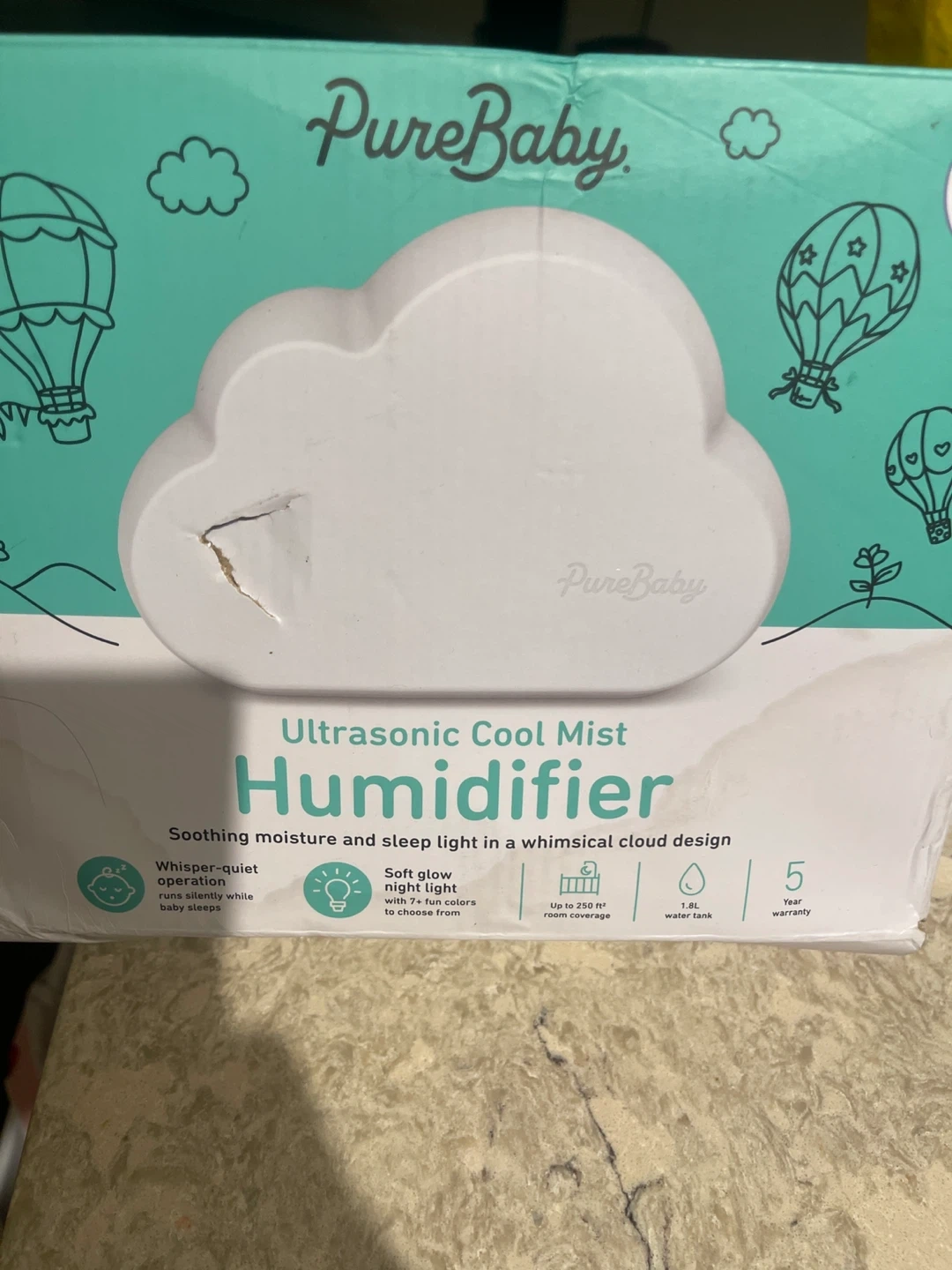 Selling a PureBaby ultrasonic cool mist humidifier! It's designed with a whimsical cloud shape and provides soothing moisture and sleep light.