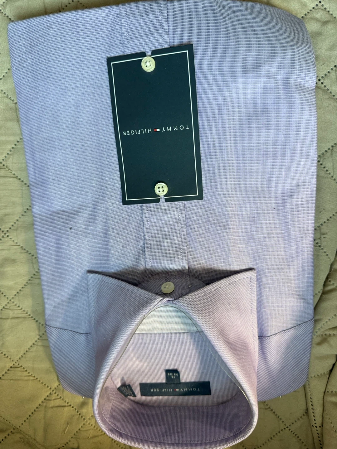 This Tommy Hilfiger dress shirt is a light purple colour. It's a size 15 with sleeves measuring 32-33 inches. Made from a comfortable fabric blend.